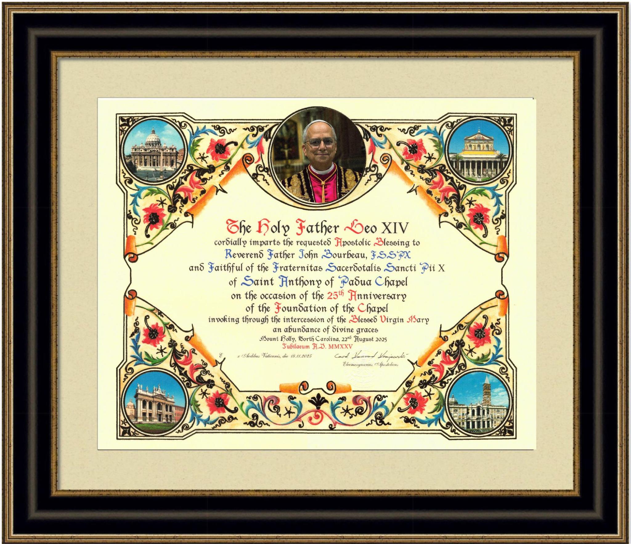 The community of St. Anthony of Padua Chapel in the Charlotte Diocese announced that it had received an Apostolic Blessing granted by Pope Leo XIV. The document, signed at the Vatican on November 18, 2025, by Cardinal Konrad Krajewski, invoked abundant graces through the intercession of the Blessed Virgin Mary on the occasion of the chapel’s twenty-fifth anniversary.