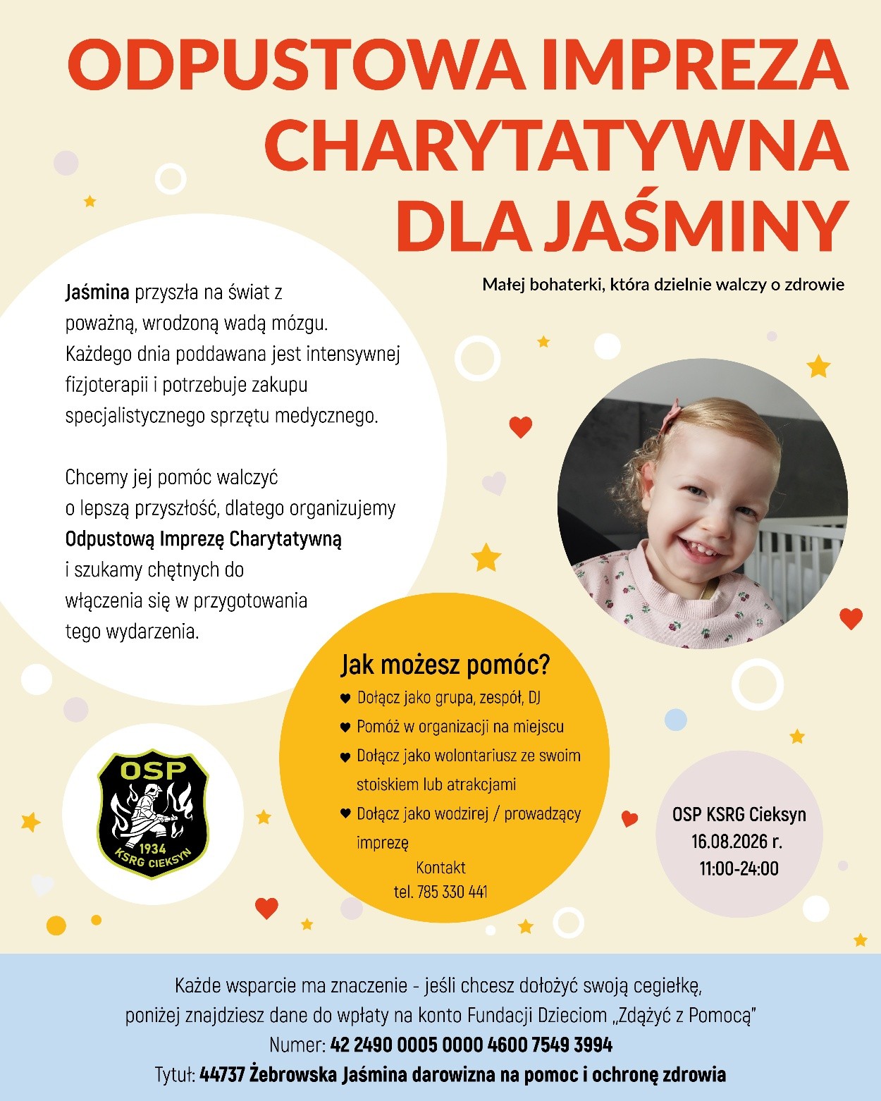 16 VIII 2026 r. w Cieksynie odbędzie się odpustowa impreza charytatywna połączona ze zbiórką na rzecz małej Jaśminy. Wydarzenie organizowane przez OSP KSRG Cieksyn będzie miało nie tylko charakter integracyjny, ale przede wszystkim pomocowy.