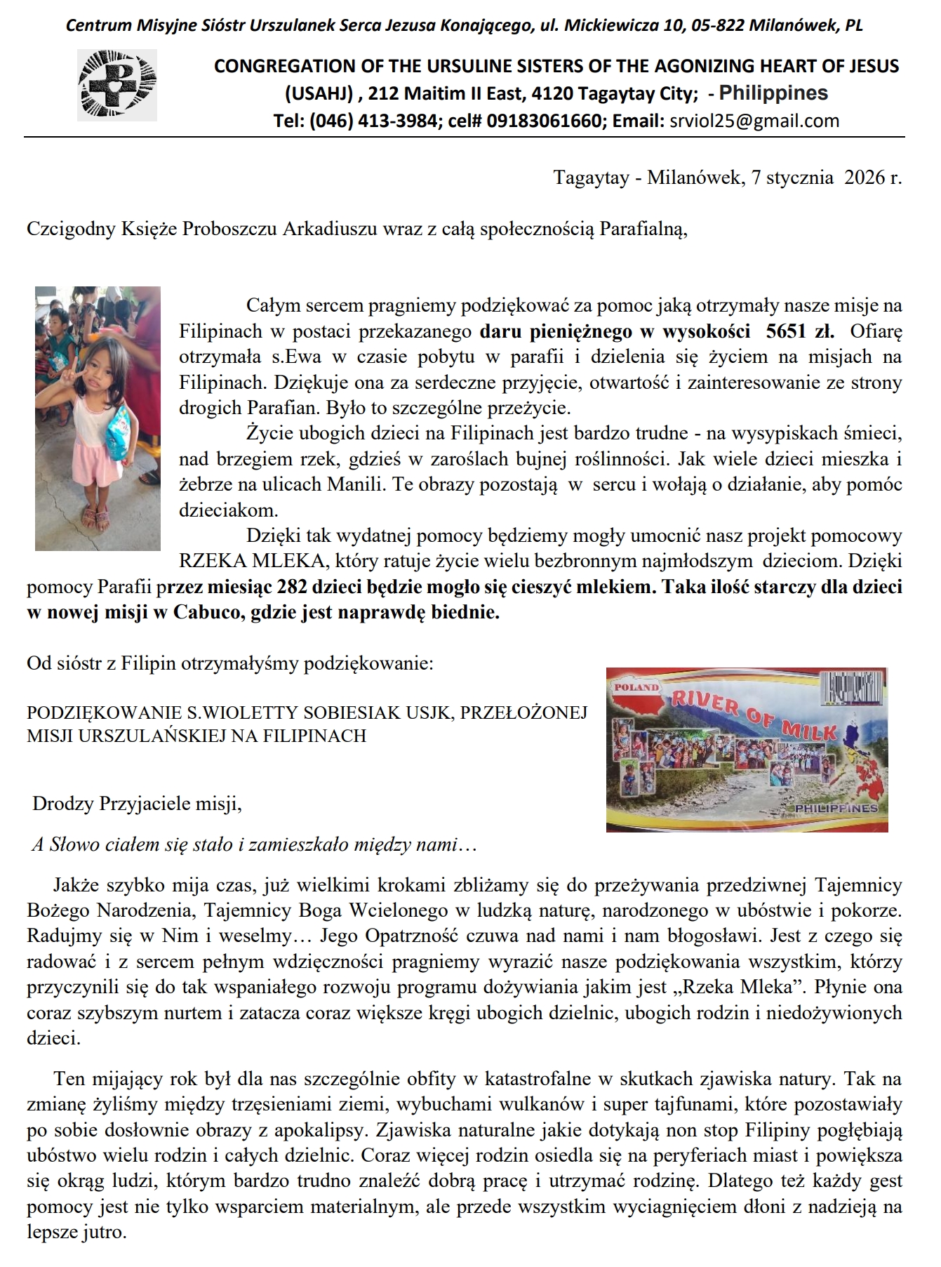 According to a letter dated January 7, 2026, sent by the Missionary Center of the Ursuline Sisters of the Agonizing Heart of Jesus in Milanówek, a monetary donation of 5,651 PLN was allocated to help the poorest children in missionary regions of the Philippines. The donation was received by Sister Ewa during her visit to the parish, where she shared testimony about missionary life.