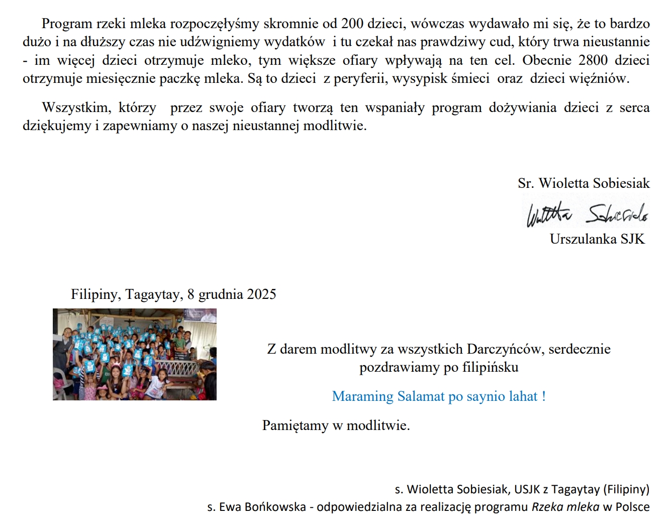 W liście podpisanym przez s. Wiolettę Sobiesiak USJK, przełożoną misji urszulańskiej na Filipinach, znalazło się także odniesienie do duchowego wymiaru wsparcia. Siostry podkreślają, że każda pomoc to nie tylko konkretne wsparcie materialne, lecz także znak nadziei i solidarności z rodzinami, które każdego dnia zmagają się z głodem i brakiem perspektyw.