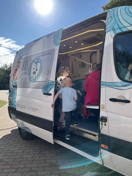On Friday, October 3, children from the Janusz Kusociński Primary School in Sowia Wola were the first in the Czosnów municipality to undergo free dental check-ups in a mobile clinic. The dental bus, rented by the municipality through an agreement with Corten Medic, was parked on the school grounds.