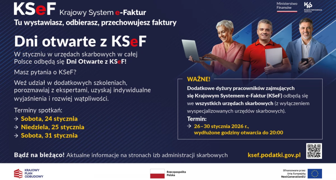 Additionally, from January 26 to January 30, 2026, the working hours of tax offices, excluding specialized offices, will be extended until 8:00 p.m. During these extended hours, on-duty employees will provide information about KSeF and explain the key steps needed to prepare for using the system.