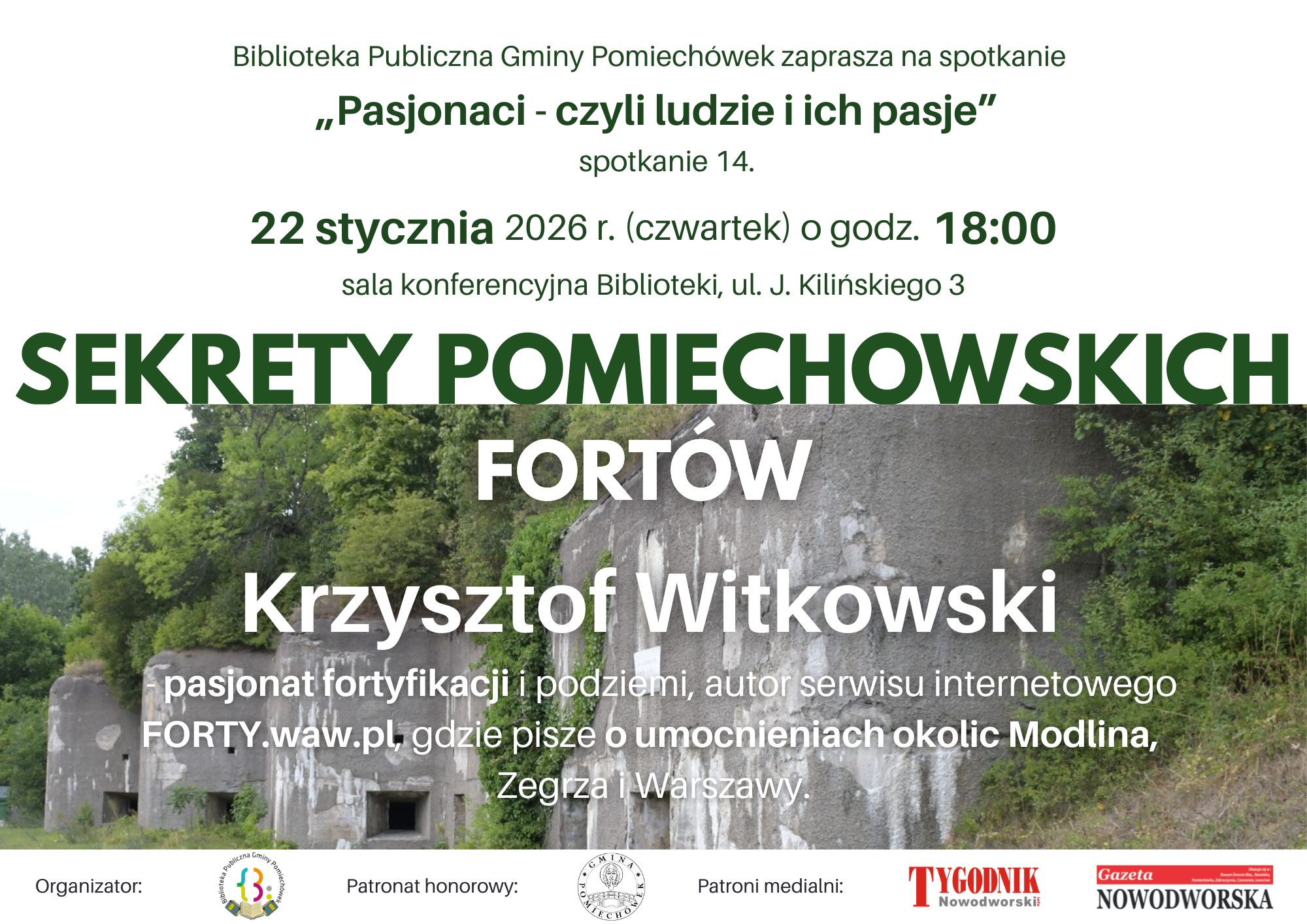 22 I 2026 r. w Biblioteka Publiczna Gminy Pomiechówek odbędzie się XIV spotkanie z cyklu „Pasjonaci – czyli ludzie i ich pasje”. Gościem wydarzenia będzie Krzysztof Witkowski, badacz i dokumentalista fortyfikacji oraz podziemi północnego Mazowsza.