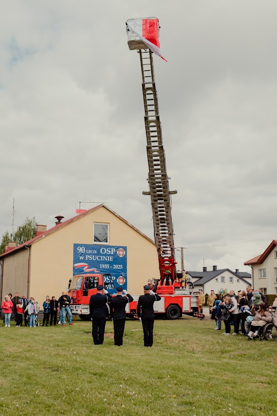 A solemn highlight was the raising of the national flag using a fire ladder lent by OSP Nowy Dwór Mazowiecki. The flag-bearers were Daniel Włodarski, Paweł Oleksa, and Mateusz Kaczyński. The ceremony was officially opened by firefighter Renata Włodarska, president of OSP Jackowo, who welcomed guests and residents, particularly greeting firefighters from Nasielsk, Cieksyn, Nuny, Krzyczki, Jaskółowo, as well as the hosts – Psucin and Jackowo units.
