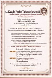 On April 14, 2026, Rev. Tadeusz Jaworski, a prelate and long-serving Catholic priest, passed away at the age of 82, after 54 years of priesthood.