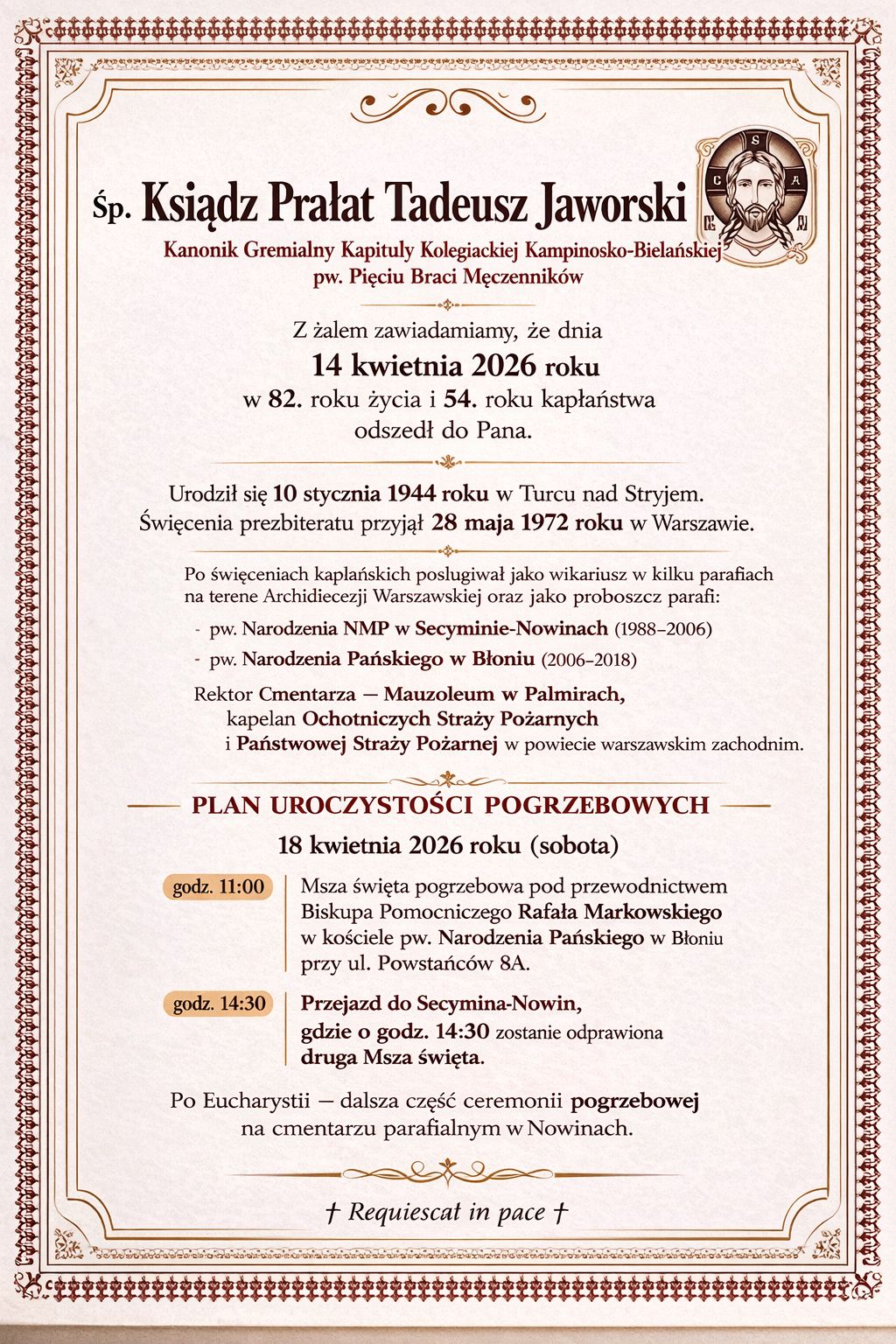 We wtorek 14 IV 2026 r. zmarł w wieku 82 lat, w 54. roku kapłaństwa, śp. ks. prał. Tadeusz Jaworski – budowniczy świątyń, duszpasterz i strażnik pamięci historycznej, przez lata związany z parafiami Mazowsza.