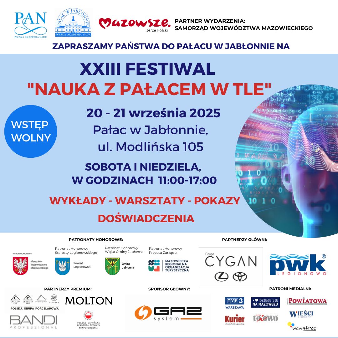 Już dziś serdecznie zapraszam Państwa do odwiedzenia XXIII Festiwalu „Nauka z Pałacem w tle”, który odbędzie się w Pałacu w Jabłonnie w dniach 20 – 21 września, w godzinach 11.00-17.00. Czekamy na Państwa i życzymy Wam wspaniałych wrażeń, doświadczeń i odkryć!