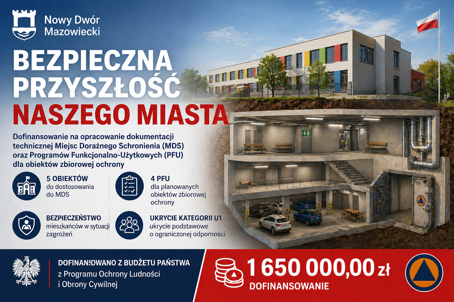 Miasto Nowy Dwór Mazowiecki otrzymało dofinansowanie z budżetu państwa zadań realizowanych z Programu Ochrony Ludności i Obrony Cywilnej z Obszaru I w wysokości 1 650 000 zł na zadania zlecone inwestycyjne – poinformował nowodworski samorząd. Środki te zostaną przeznaczone na opracowanie dokumentacji technicznej dostosowania pięciu obiektów użyteczności publicznej do Miejsc Doraźnego Schronienia (MDS) oraz opracowanie czterech Programów Funkcjonalno-Użytkowych (PFU) planowanych do wybudowania w kolejnych latach obiektów zbiorowej ochrony.