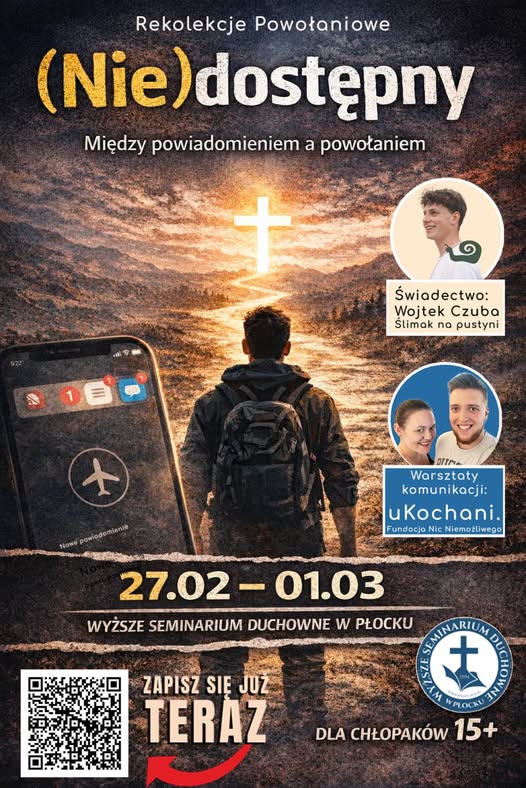 The Higher Theological Seminary in Płock invites young men to vocational retreats under the theme “(Un)available.” The event will take place from February 27 to March 1, 2026. It is addressed to boys aged 15 and older.