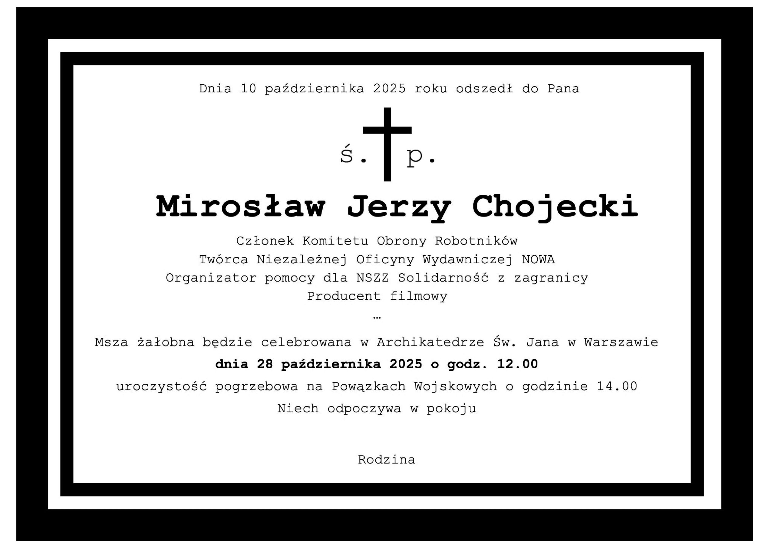 W wieku 76 lat zmarł Mirosław Jerzy Chojecki – legenda opozycji demokratycznej, założyciel Niezależnej Oficyny Wydawniczej „NOWa”, która w czasach PRL-u stała się największym wydawnictwem działającym poza cenzurą. Kawaler Orderu Orła Białego odszedł 10 X 2025 r.