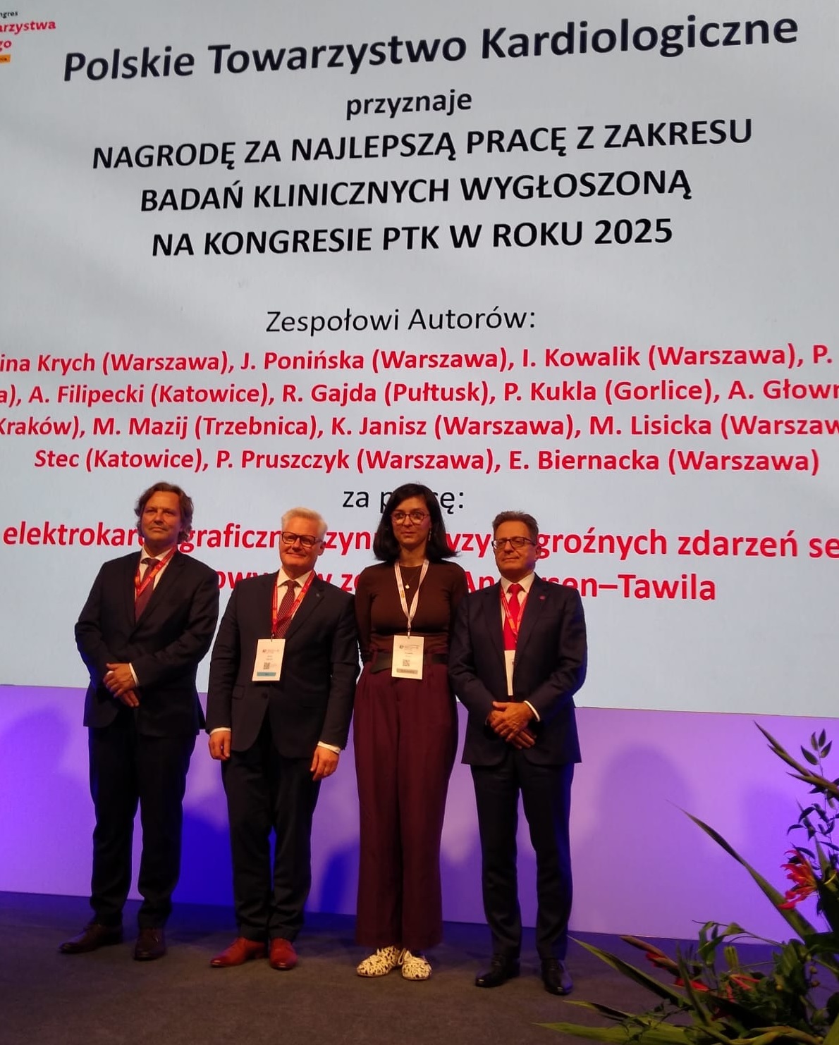 The XXIX PTK Congress took place in Krakow on September 25-27, 2025. During the ceremonial opening session, a paper titled „New Electrocardiographic Risk Factors for Serious Cardiovascular Events in Andersen-Tawil Syndrome” was awarded. This is a special distinction because the Polish Society of Cardiology awards it annually to only one, the best paper in this category.