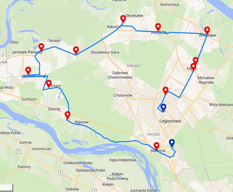 Na trasie znajdą się m.in. parafia Matki Bożej Królowej Polski w Jabłonnie, parafia św. Andrzeja Boboli w Rajszewie, parafia św. Bartłomieja Apostoła w Janówku Pierwszym, parafia św. Jana Marii Vianneya w Kałuszynie oraz parafia Przemienienia Pańskiego w Wieliszewie. Pielgrzymi odwiedzą także parafię Miłosierdzia Bożego w Legionowie, a zakończenie Drogi Krzyżowej zaplanowano w Kaplicy Adoracji parafii św. Jana Kantego w Legionowie.