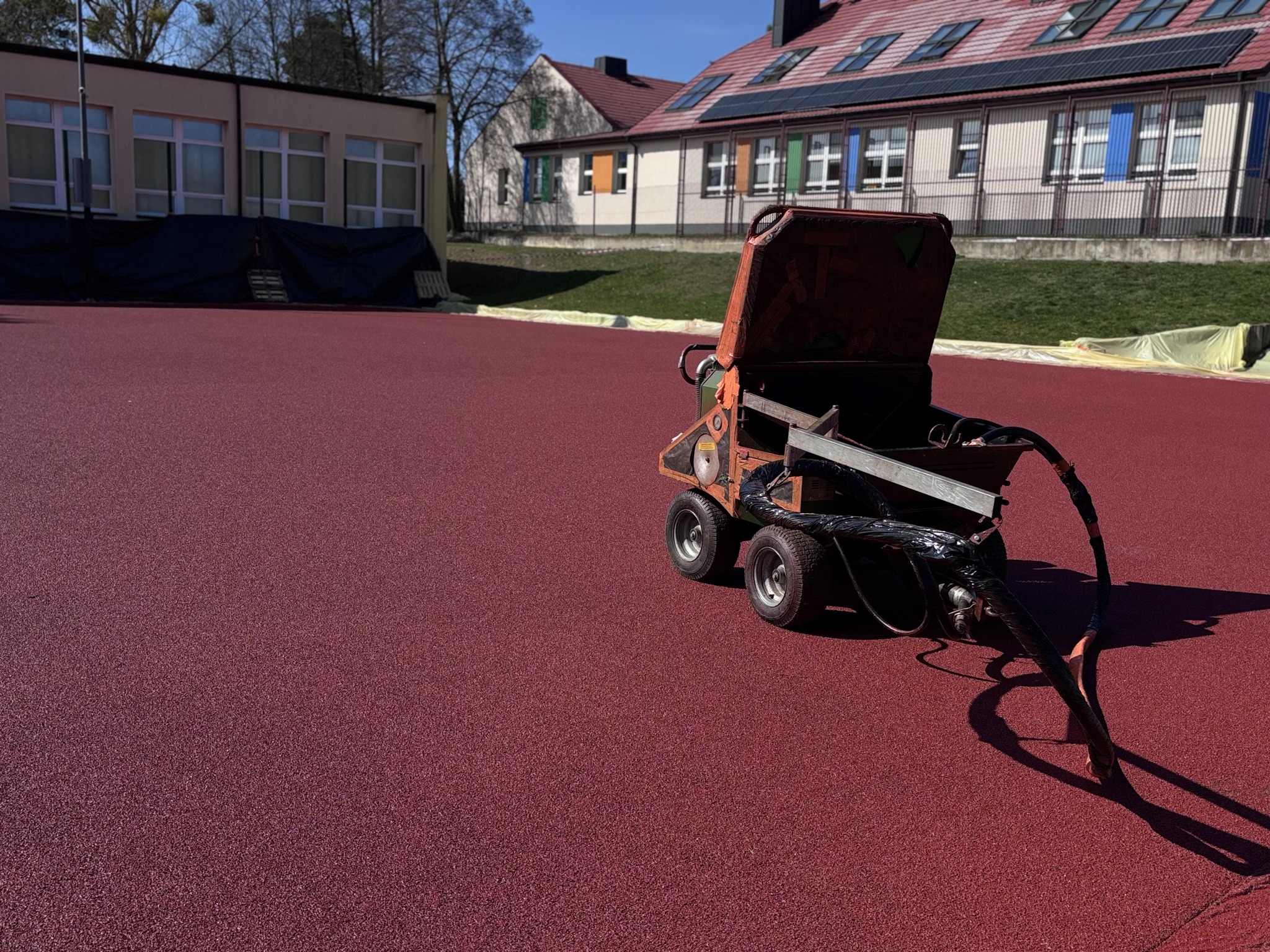 The works on the modernization of the sports field and running track at the School-Preschool Complex No. 3 in Nowy Dwór Mazowiecki are entering a decisive phase. The contractor is performing a spray application of the new polyurethane surface.