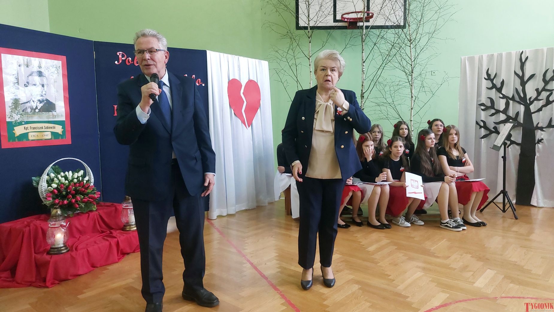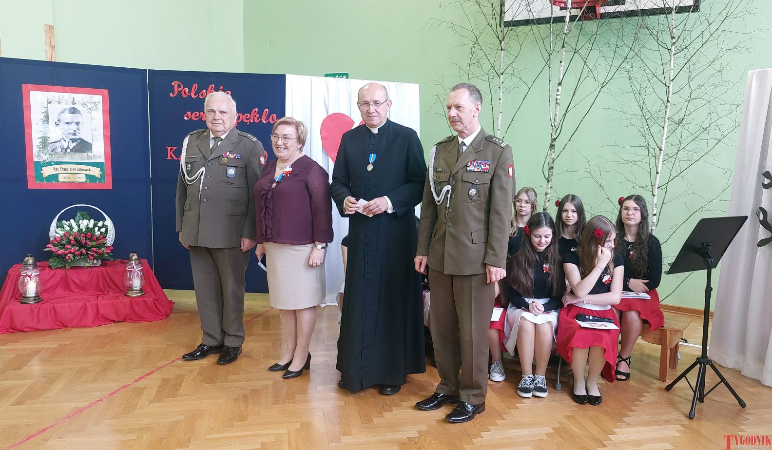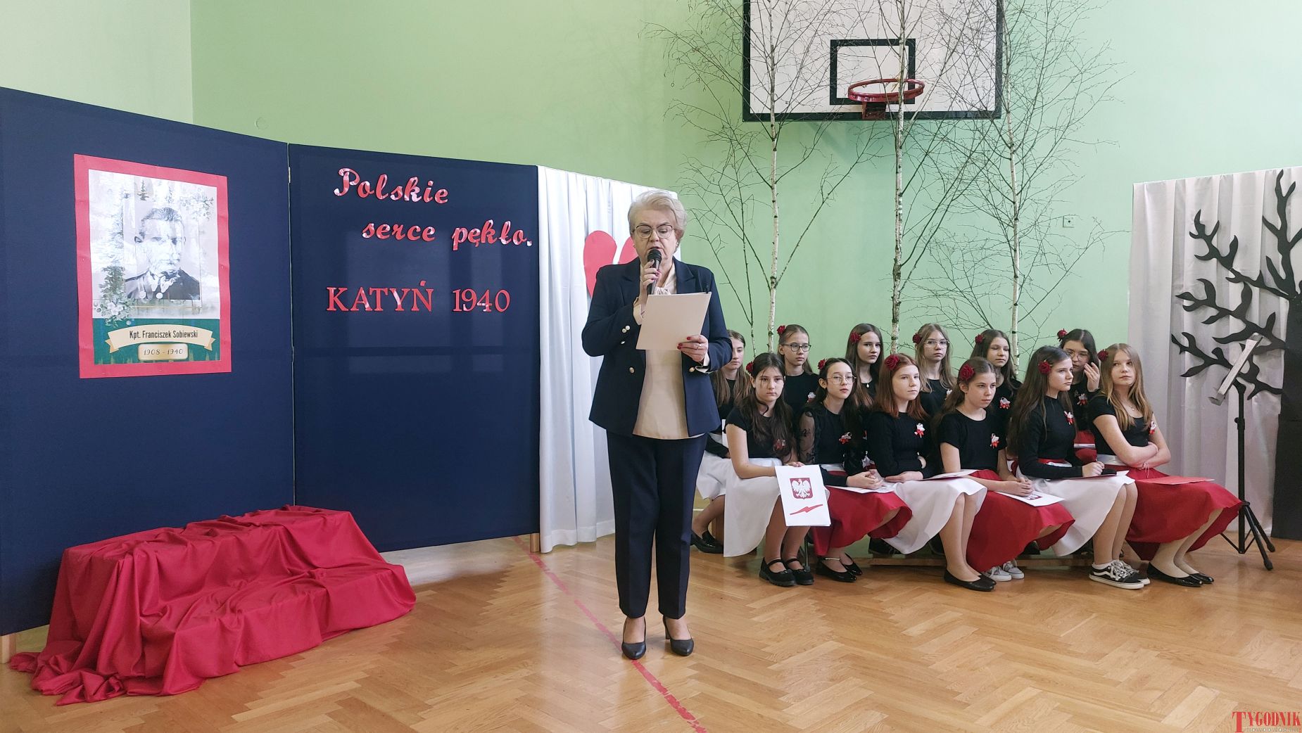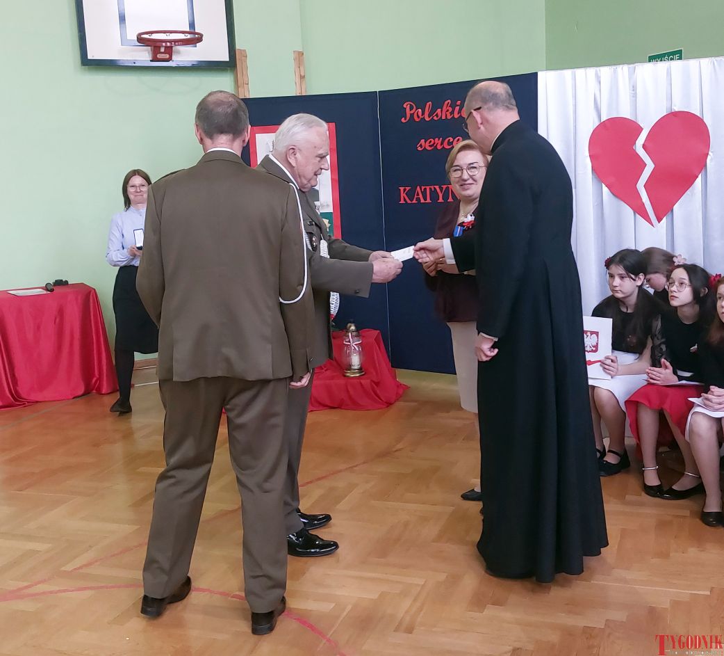 The event began with the entrance of the school’s flag and the singing of the national anthem. School principal Mirosława Grzegorczyk welcomed guests and recalled the figure of Capt. Franciszek Sobiewski of the Electrotechnical Battalion from Nowy Dwór Mazowiecki, who was murdered in Katyń. His memory was honored in 2010 with a „Katyń Memorial Oak” planted on school grounds, a tradition continued annually.