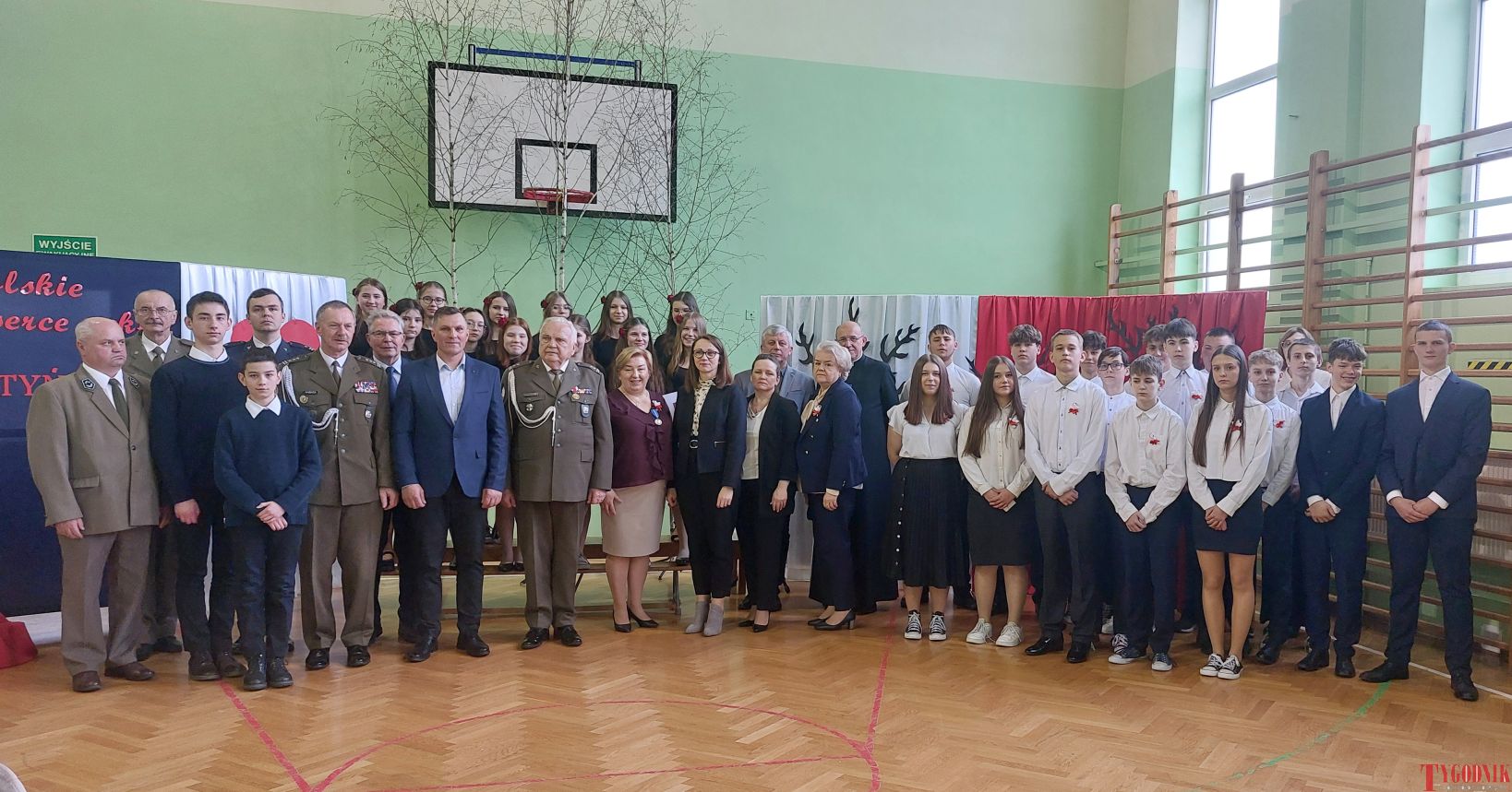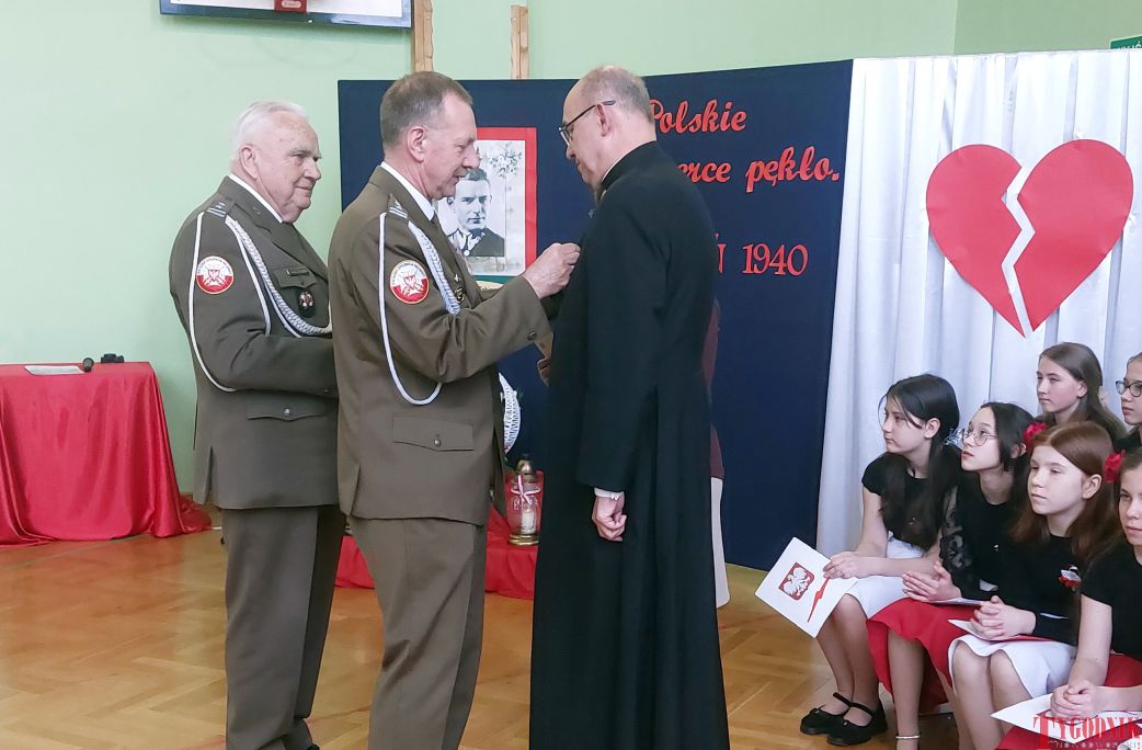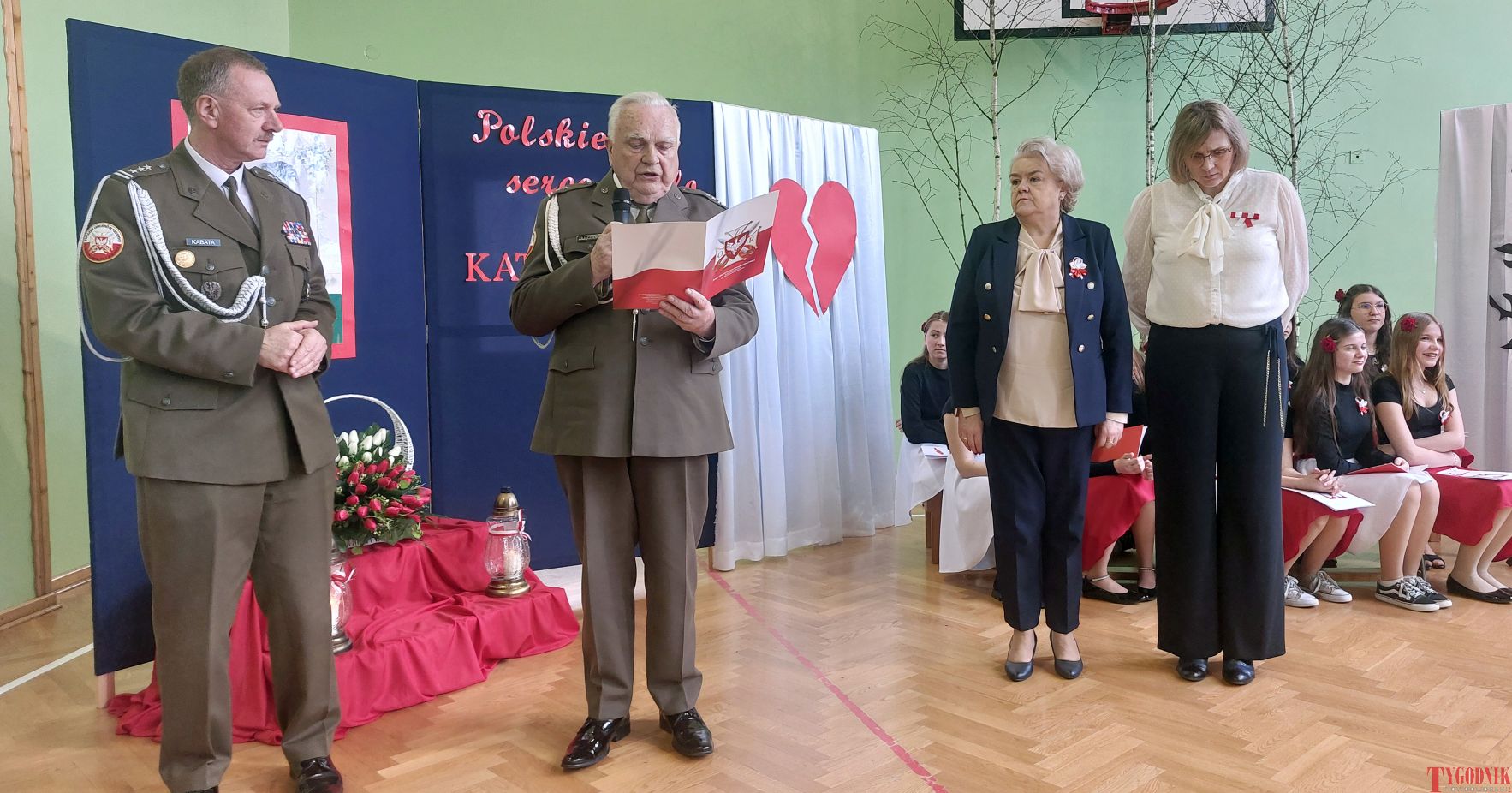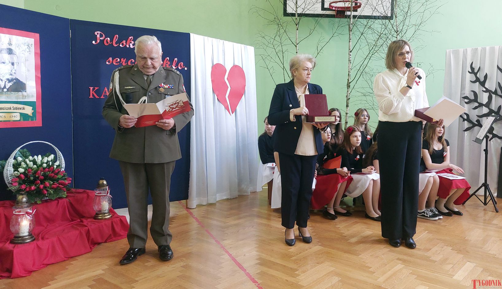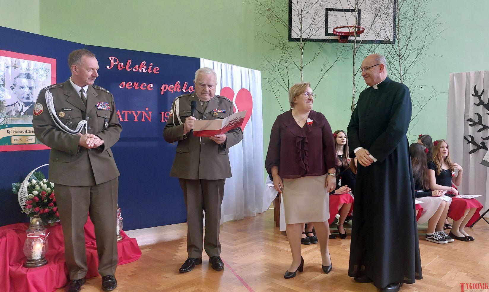 The event began with the entrance of the school’s flag and the singing of the national anthem. School principal Mirosława Grzegorczyk welcomed guests and recalled the figure of Capt. Franciszek Sobiewski of the Electrotechnical Battalion from Nowy Dwór Mazowiecki, who was murdered in Katyń. His memory was honored in 2010 with a „Katyń Memorial Oak” planted on school grounds, a tradition continued annually.