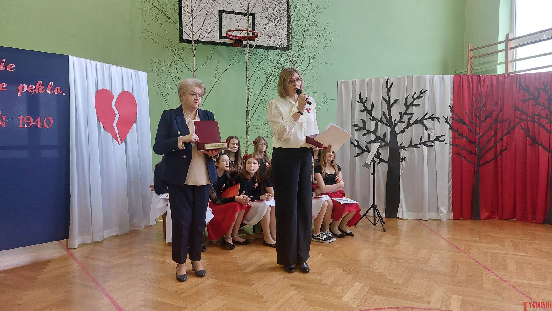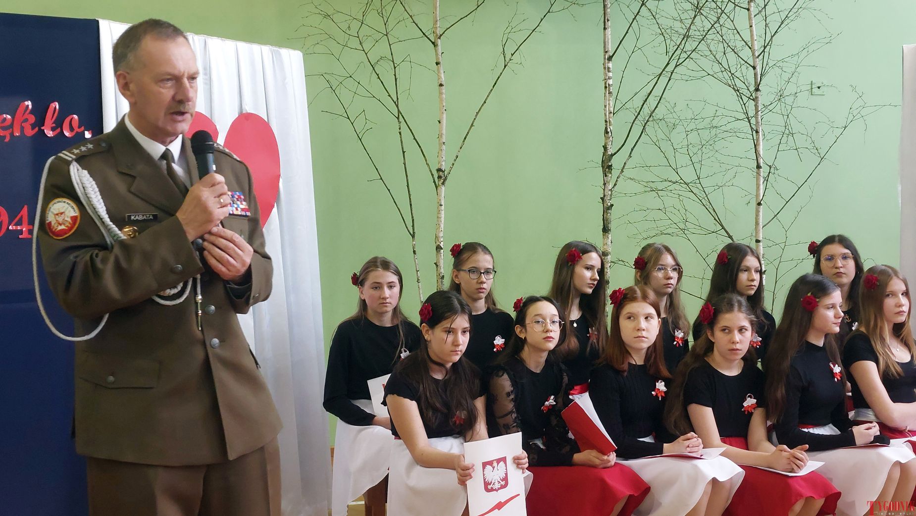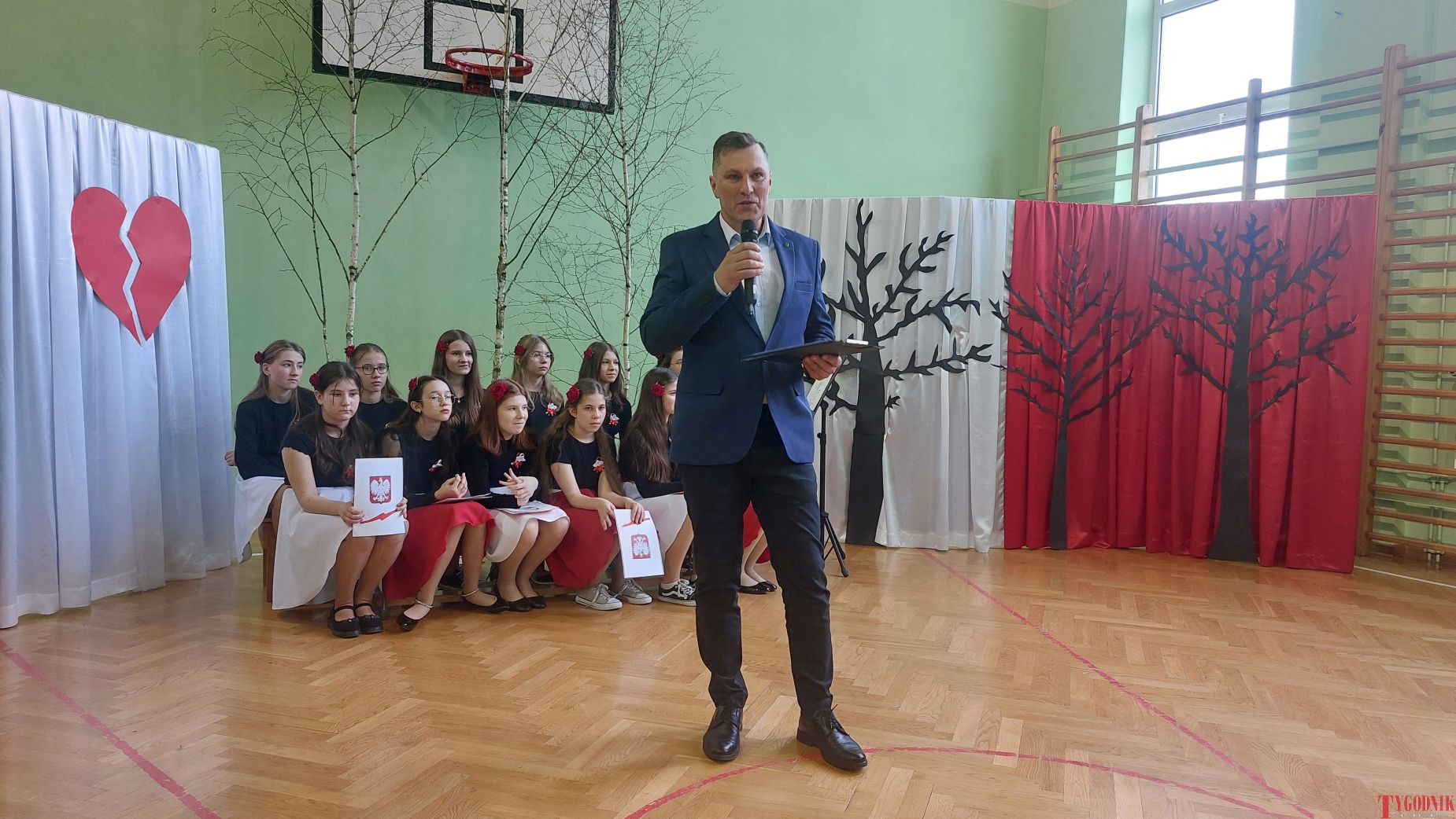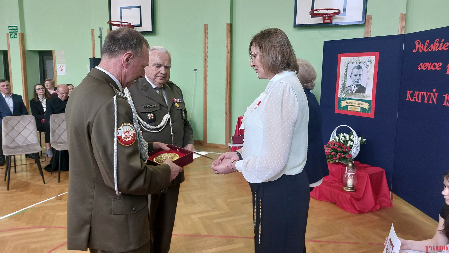 The event began with the entrance of the school’s flag and the singing of the national anthem. School principal Mirosława Grzegorczyk welcomed guests and recalled the figure of Capt. Franciszek Sobiewski of the Electrotechnical Battalion from Nowy Dwór Mazowiecki, who was murdered in Katyń. His memory was honored in 2010 with a „Katyń Memorial Oak” planted on school grounds, a tradition continued annually.