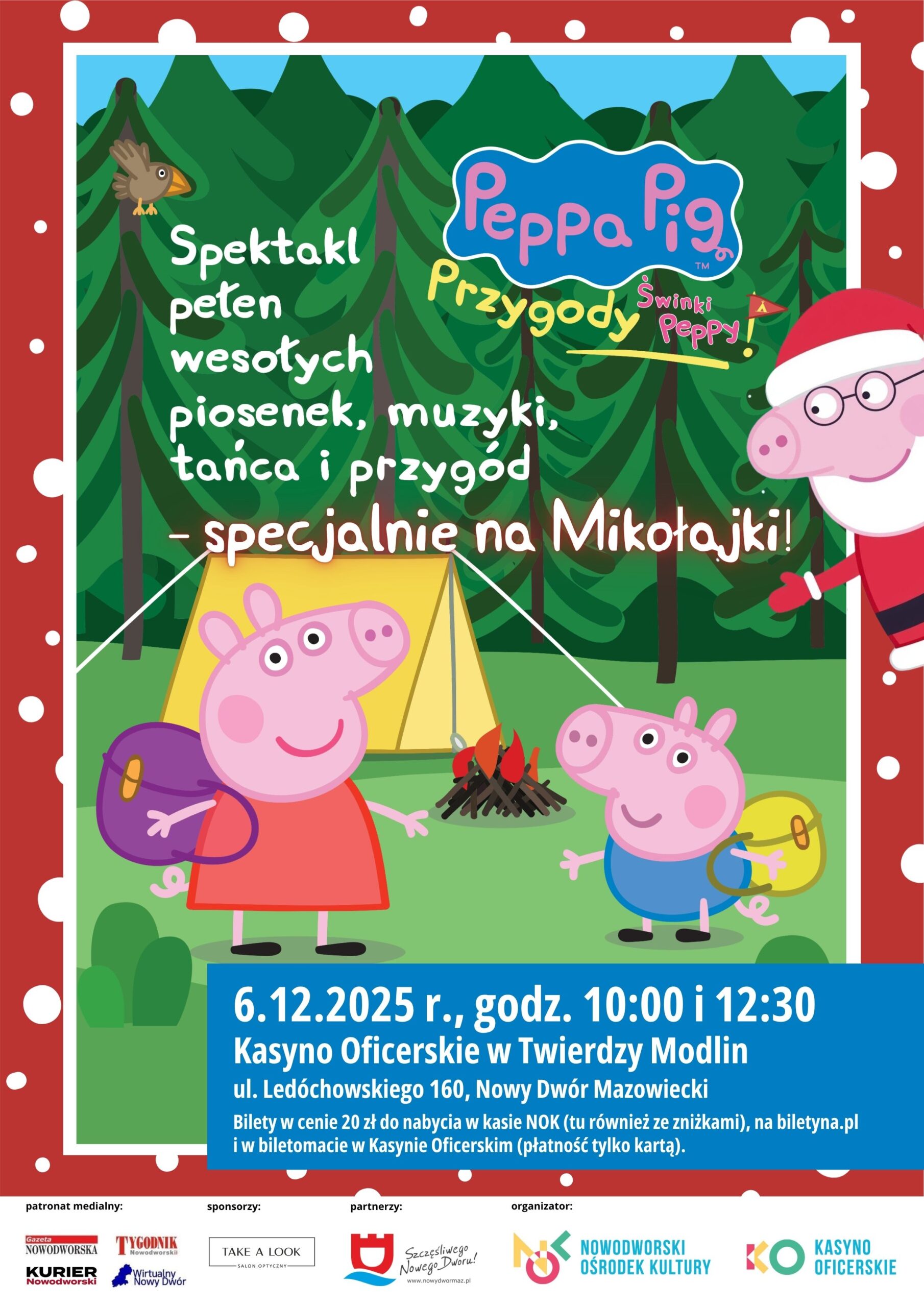Spektakl „Przygody Świnki Peppy” odbędzie się 6 XII 2025 r. o 10.00 przed poł. oraz 12.30 po poł. w Kasynie Oficerskim przy ul. Ledóchowskiego 160 w Nowym Dworze. Nowodworski Ośrodek Kultury przygotował wydarzenie specjalnie z myślą o najmłodszych widzach, którzy świętując Mikołajki, będą mogli zanurzyć się w kolorowy świat ukochanej bohaterki.