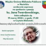 19 marca 2026 r. o godz. 17.00 nasielska biblioteka zaprasza na spotkanie z poezją ks. Jana Twardowskiego pod hasłem: „Śpieszmy się kochać ludzi – poezja, która zostaje”. Wydarzenie odbędzie się w Czytelni Biblioteki. Gośćmi specjalnymi będą Anna Czachorowska oraz Filip Borowski.