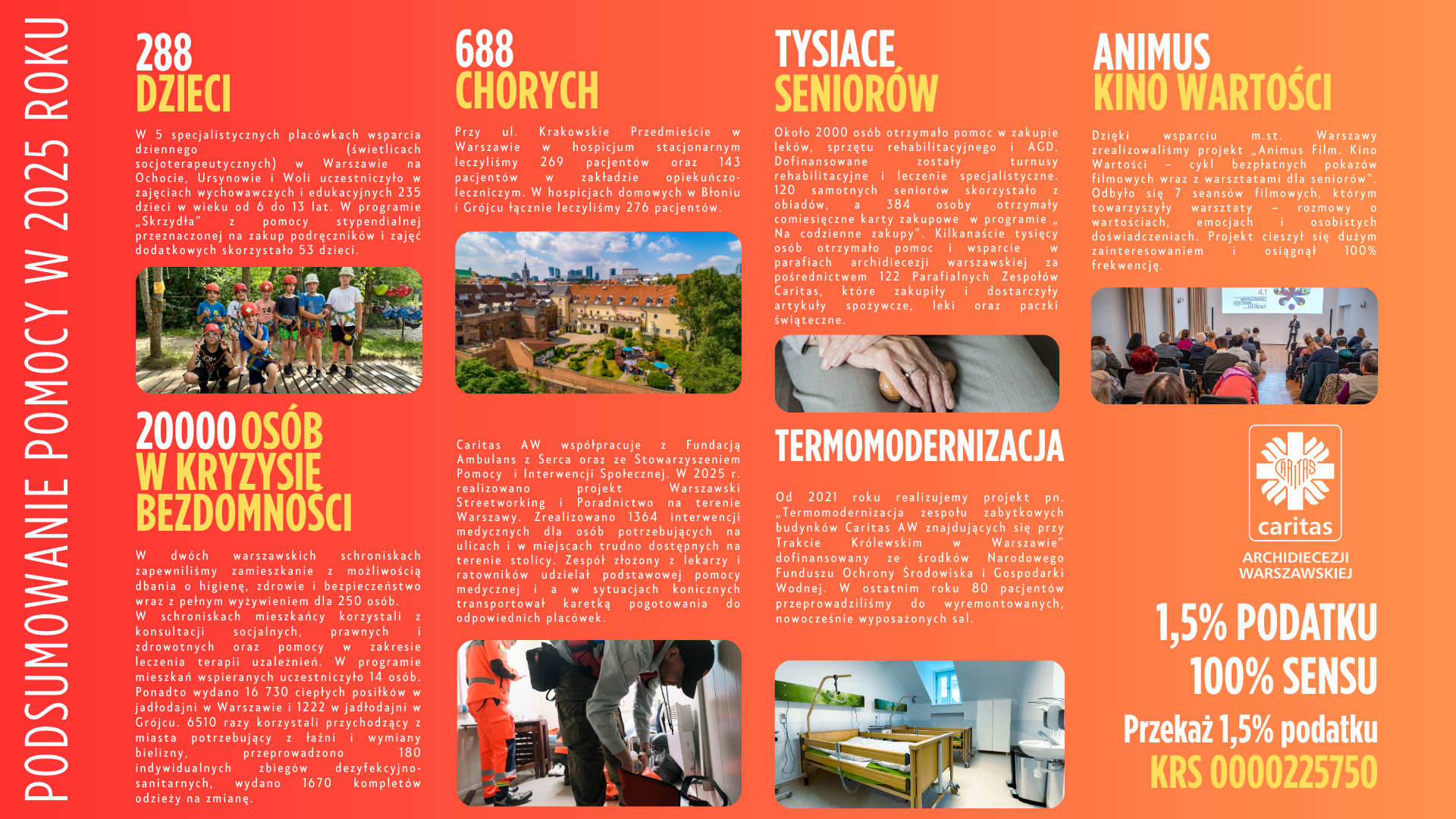 Rok 2025 był okresem intensywnej pomocy skierowanej do chorych, dzieci, seniorów, bezdomnych, rodzin oraz uchodźców wymagających wsparcia materialnego i psychicznego. Działania prowadzono zarówno w placówkach stacjonarnych i środowiskowych, jak i w przestrzeni publicznej, we współpracy z instytucjami państwowymi, samorządami, organizacjami pozarządowymi oraz parafiami archidiecezji warszawskiej.