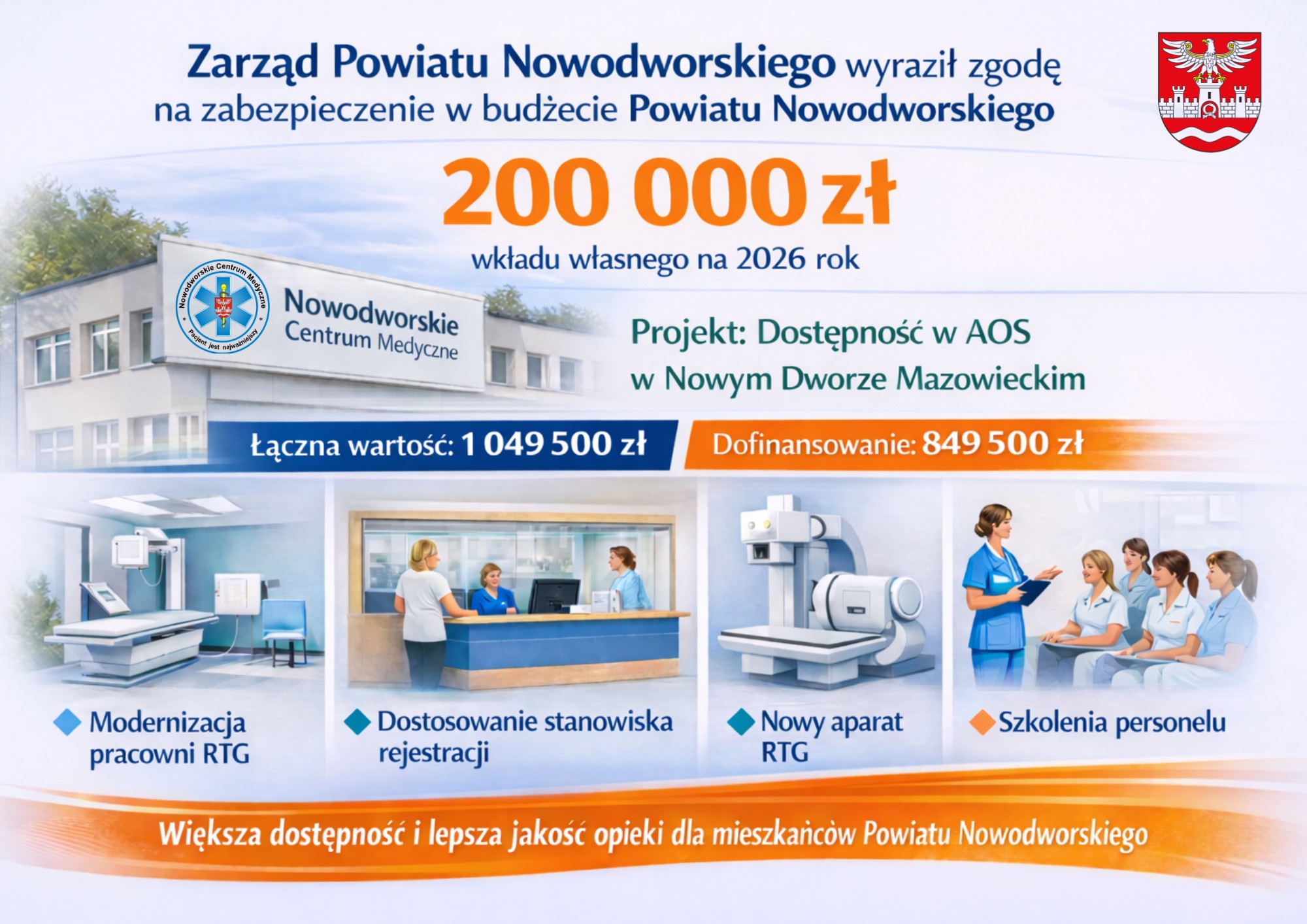 Powiat Nowodworski przeznaczy 200 000 zł wkładu własnego na projekt realizowany przez Nowodworskie Centrum Medyczne. Dzięki temu placówka otrzyma prawie 850 000 zł dofinansowania z Funduszy Europejskich. W praktyce oznacza to wygodniejszą i bezpieczniejszą opiekę dla pacjentów.