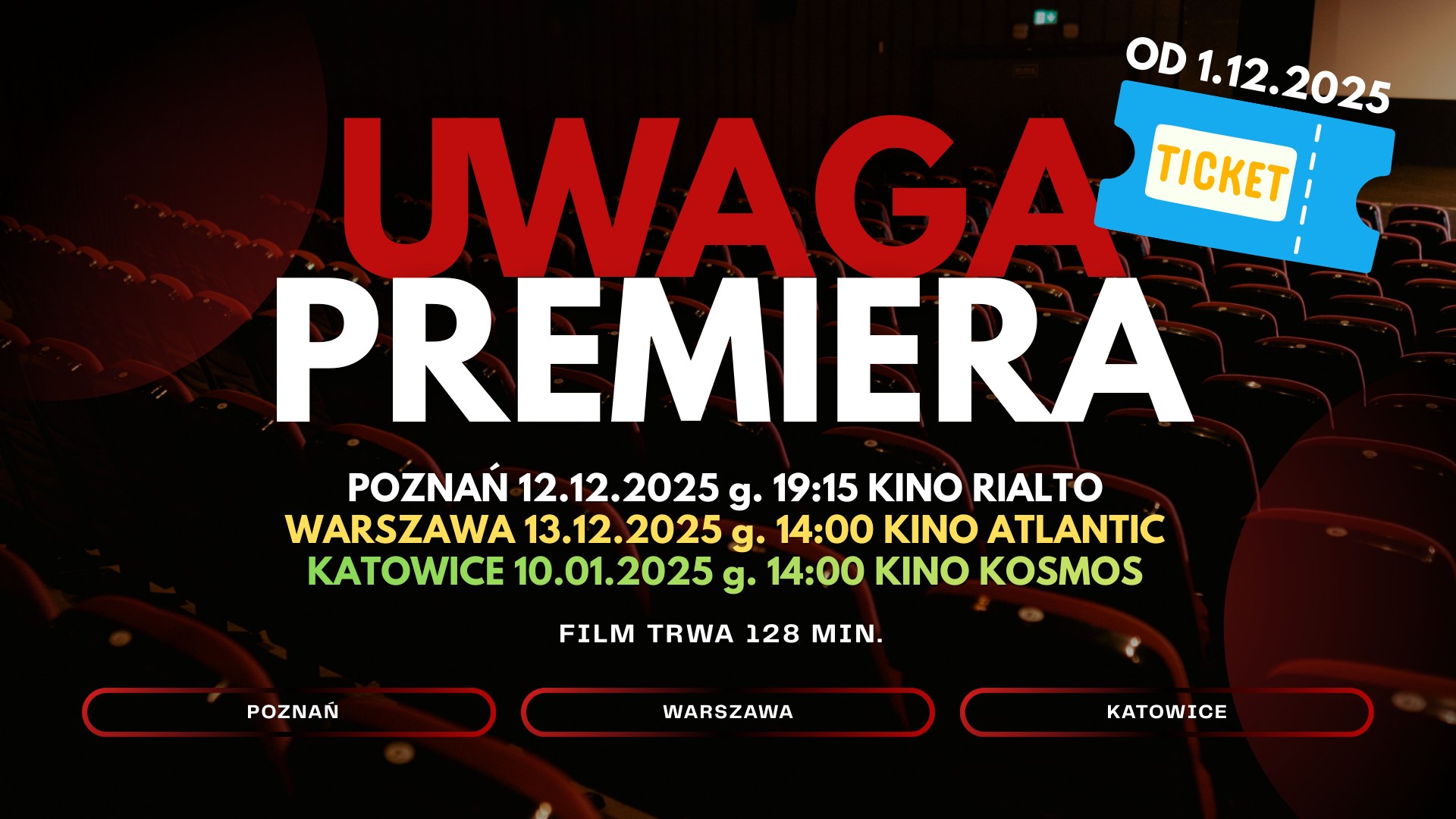 W Poznaniu premierowy pokaz wyznaczono na 12 XII 2025 r. o 7.15 wiecz. w kinie Rialto. Dzień później, 13 XII 2025 r. o 2.00 po poł., film zostanie zaprezentowany w Warszawie w kinie Atlantic. Ten warszawski seans będzie miał rozszerzoną formułę: po projekcji zaplanowano spotkanie z twórcami i panel dyskusyjny, który potrwa około trzech godzin. Organizatorzy podkreślają, że dostępność biletów w systemie kin rozpocznie się 1 XII 2025 r.