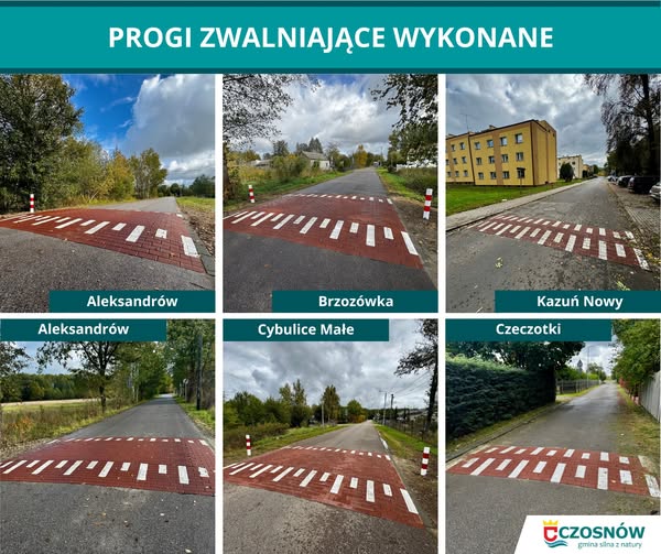 Zgodnie z wolą wyrażoną na zebraniach sołeckich, gmina zamontowała sześć nowych progów zwalniających w pięciu miejscowościach: Aleksandrów (dwa progi), Brzozówka, Cybulice Małe, Czeczotki i Kazuń Nowy. Inwestycja, sfinansowana z Funduszy Sołeckich, ma na celu poprawę bezpieczeństwa na lokalnych drogach. Władze gminy podkreślają, że jest to znak realnego wpływu mieszkańców na swoje otoczenie i dziękują sołectwom za współpracę.