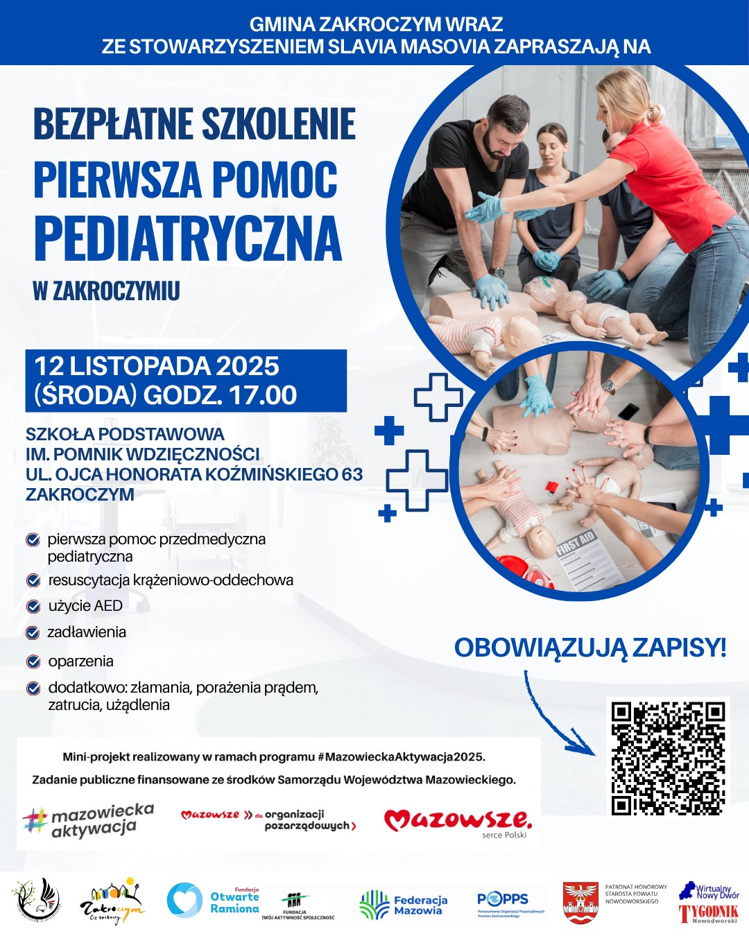 The training will take place on November 12 at 5:00 p.m. and will last about three hours. The classes will be conducted by qualified medical rescuers as part of the #MazowieckaAktywacja program, in cooperation with the Zakroczym Municipality and the Otwarte Ramiona Foundation.