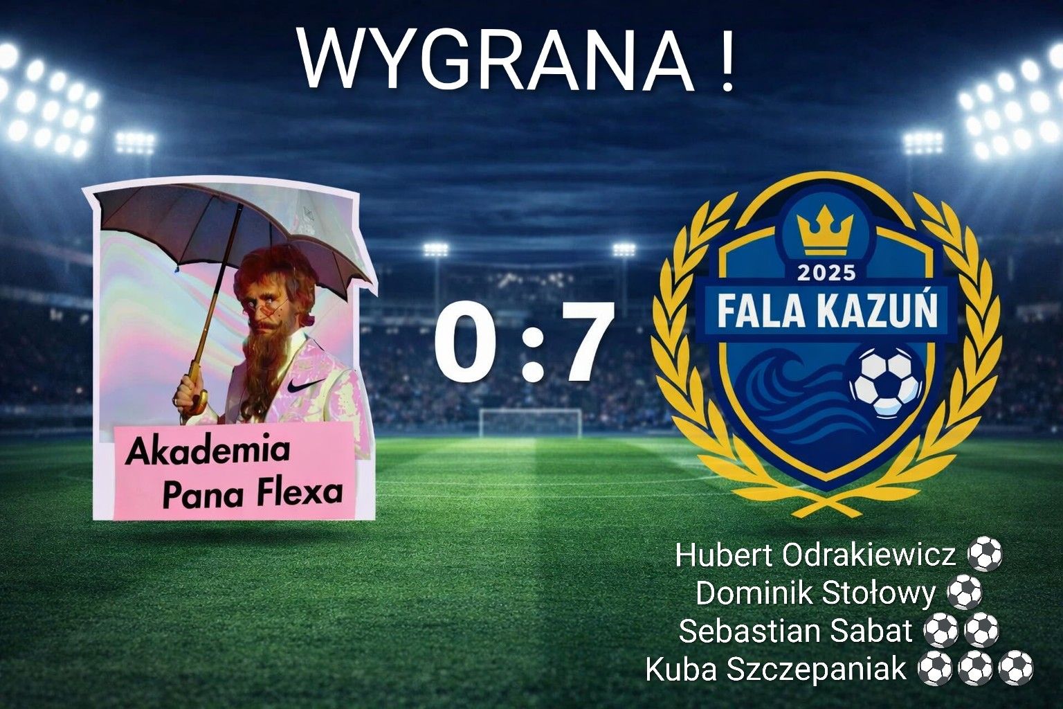 18 IV 2026 r. Fala Kazuń odniosła efektowne zwycięstwo w rozgrywkach Stowarzyszenia Legionowskie Amatorskie Ligi Piłkarskie, pokonując Akademię Pana Flexa 7:0. Wynik, choć jednoznaczny, nie oddaje w pełni przebiegu pierwszej części spotkania.
