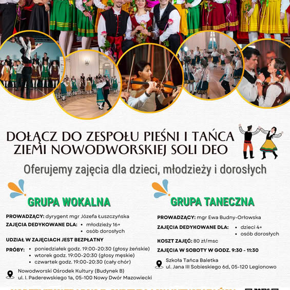 To propozycja dla tych, którzy chcą śpiewać, współtworzyć i być częścią żywej tradycji. Zespół Pieśni i Tańca Ziemi Nowodworskiej „Soli Deo” otwiera się na nowych członków, zapraszając do wspólnej pracy artystycznej nad kolejnym programem.