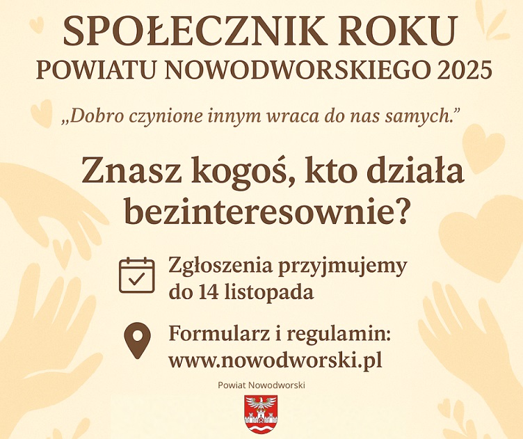 Cichych bohaterów codzienności czas docenić. Starostwo Powiatowe w Nowym Dworze Mazowieckim ogłosiło konkurs „Społecznik Roku Powiatu Nowodworskiego”. Nagrodzeni zostaną ci, którzy bez rozgłosu angażują się na rzecz lokalnej społeczności.