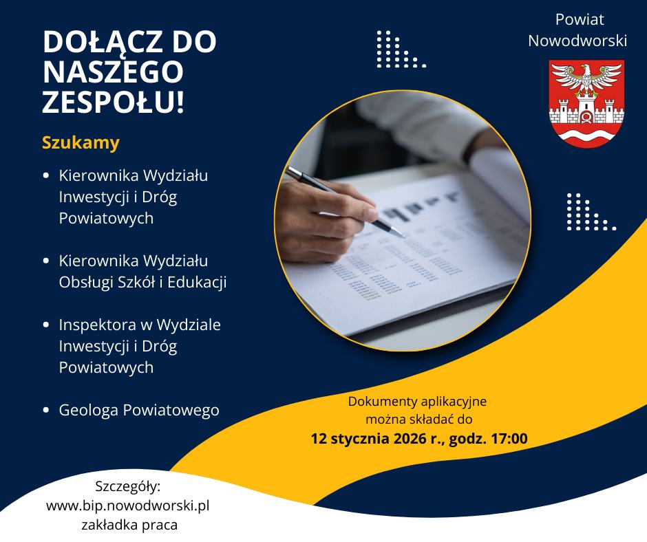 Powiat nowodworski prowadzi aktualnie rekrutację na cztery stanowiska w administracji publicznej. Ogłoszenia opublikowano na początku stycznia 2026 r. w Biuletynie Informacji Publicznej oraz na profilach społecznościowych urzędu.