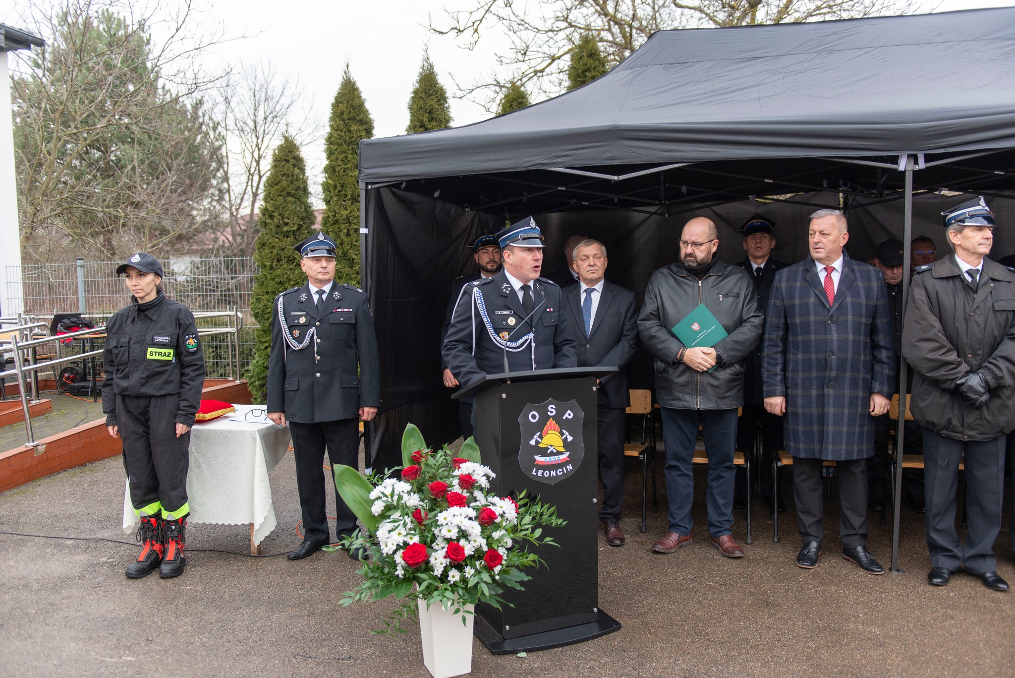 Uroczystość odbyła się 5 XII 2025 r. Rozpoczęła się złożeniem meldunku przez dowódcę uroczystości druha Jakuba Krawczaka członkowi Zarządu Oddziału Wojewódzkiego ZOSP RP Województwa Mazowieckiego, druha Mariuszowi Torbusowi. Po nim nastąpił przegląd pododdziału, uroczyste podniesienie flagi państwowej na maszt i odśpiewanie hymnu państwowego. Prezes OSP Leoncin przywitał zgromadzonych.