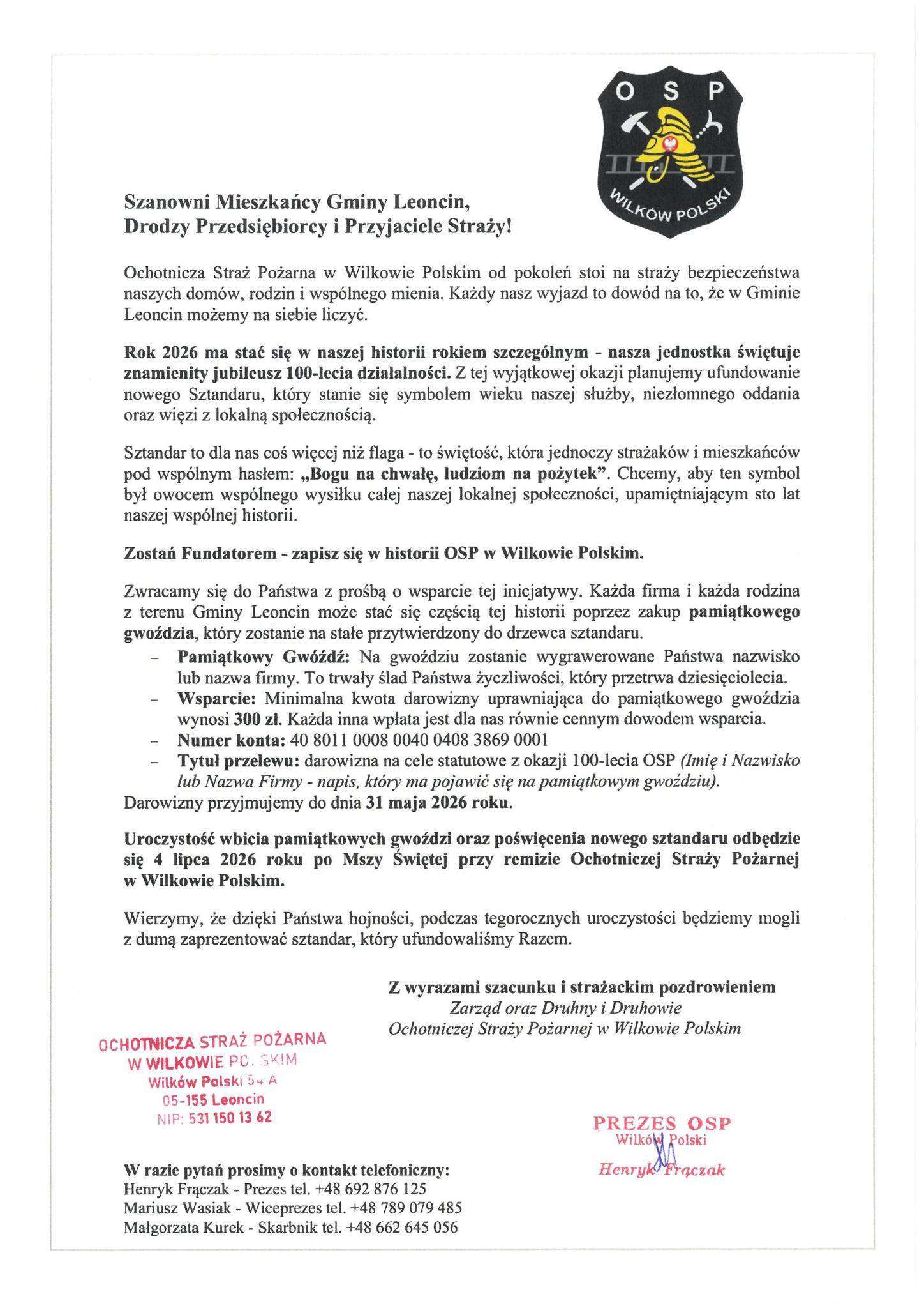 Numer konta: 40 8011 0008 0040 0488 3869 0001. Tytuł przelewu: *darowizna na cele statutowe z okazji 100-lecia OSP (Imię i Nazwisko lub Nazwa Firmy – napis, który ma pojawić się na pamiątkowym gwoździu)*. Darowizny przyjmowane są do 31 V 2026 r. Uroczystość wbicia pamiątkowych gwoździ oraz poświęcenia nowego sztandaru odbędzie się 4 VII 2026 r. po Mszy Świętej przy remizie OSP w Wilkowie Polskim. – Wierzymy, że dzięki Państwa hojności, podczas tegorocznych uroczystości będziemy mogli z dumą zaprezentować sztandar, który ufundowaliśmy Razem – podkreśla zarząd.