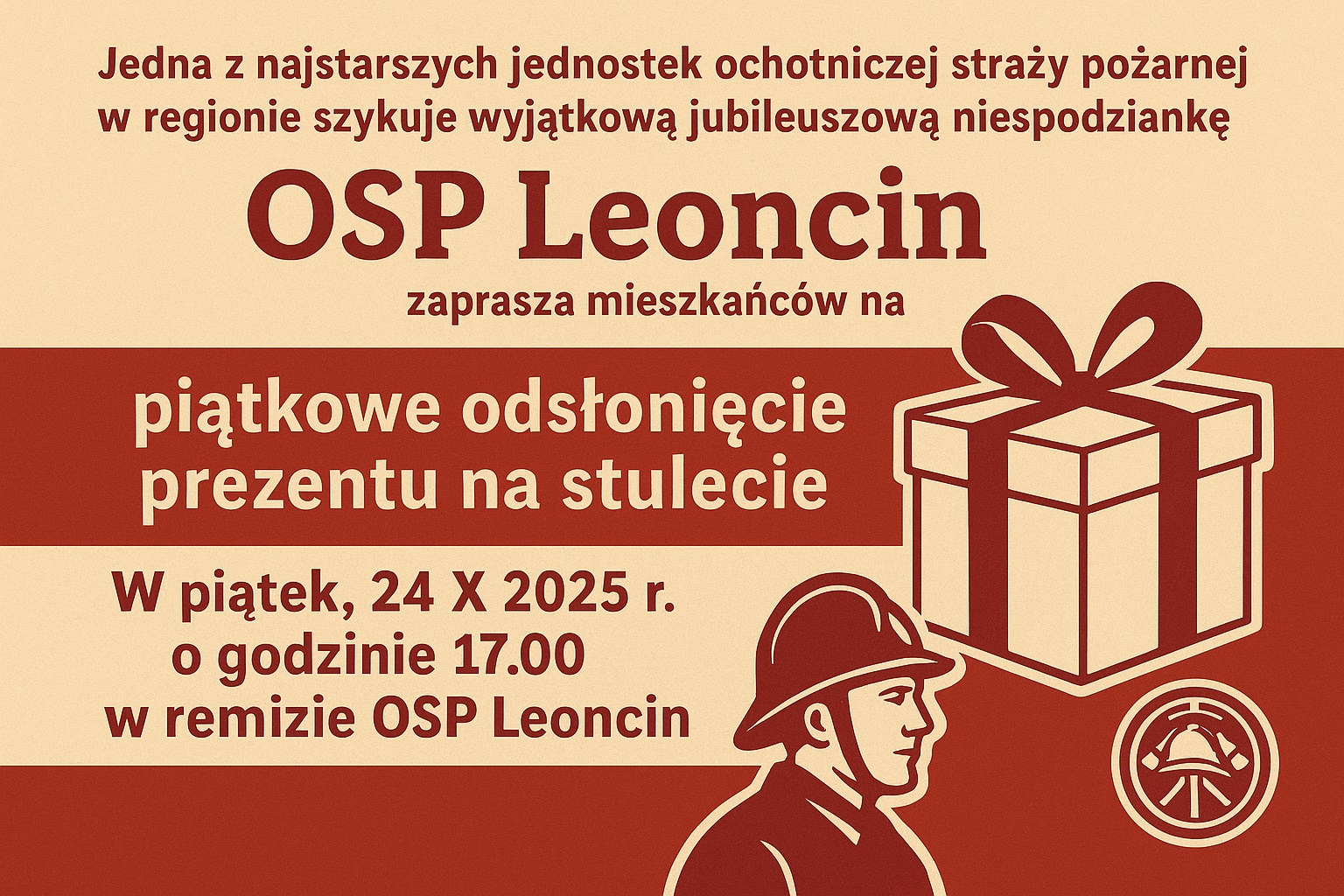 W piątek, 24 X 2025 r., o godzinie 5.00 wiecz. w remizie OSP Leoncin odbędzie się uroczyste wydarzenie z okazji 100-lecia powstania jednostki. Strażacy zapowiadają przekazanie ogromnego prezentu – zarówno dla bezpieczeństwa mieszkańców, jak i dla naszych ochotników, zachowując jednak pełną tajemniczość co do jego charakteru.