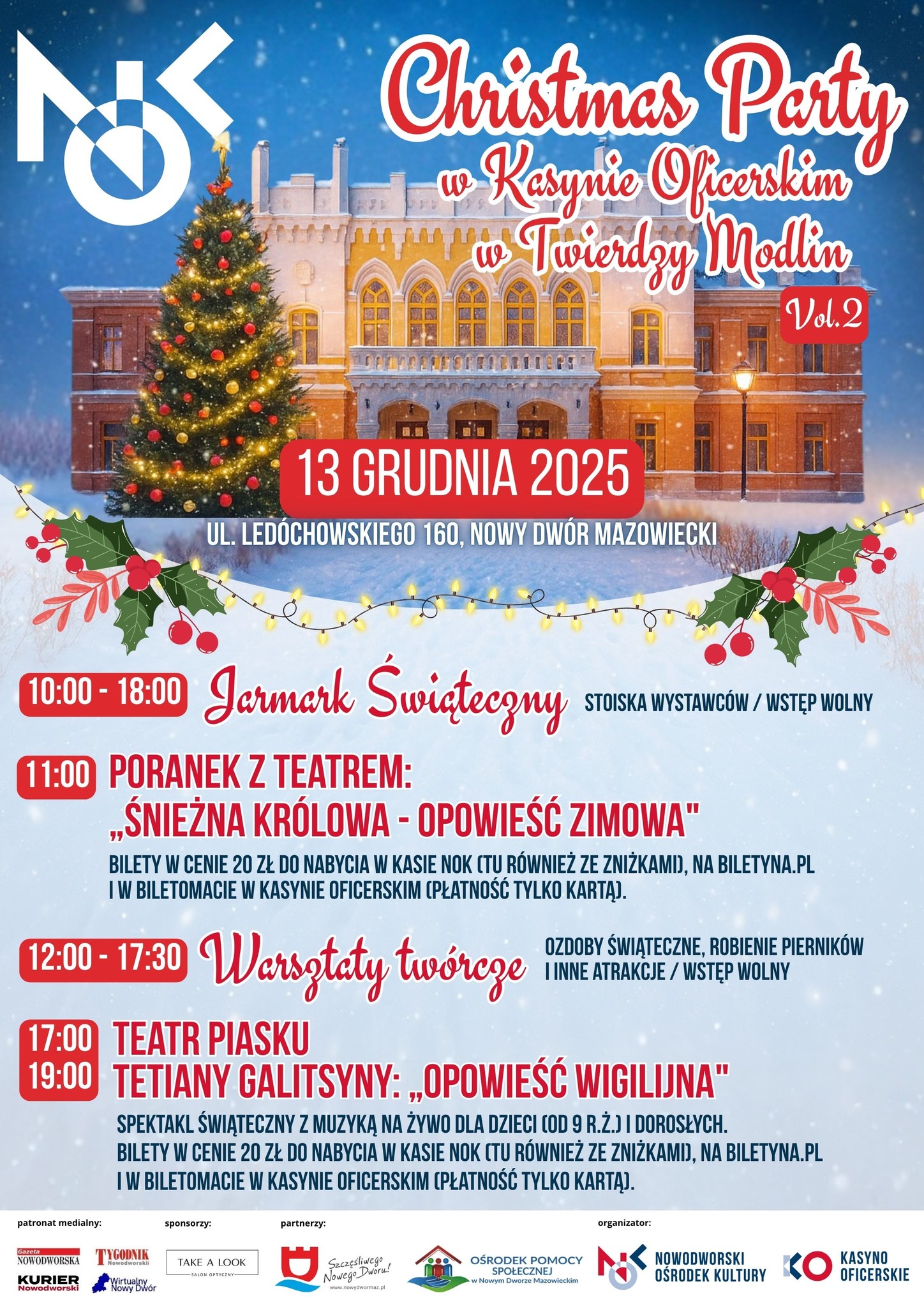 13 XII 2025 r. w Kasynie Oficerskim w Twierdzy Modlin odbędzie się druga edycja Christmas Party. – Zapraszamy na 50 wystawców, warsztaty dla całych rodzin, mnóstwo niespodzianek, spektakl teatralny dla dzieci, a wieczorem pierwszy raz u nas – Teatr Piasku Galitsyna Art Group – zapowiada Nowodworski Ośrodek Kultury.