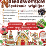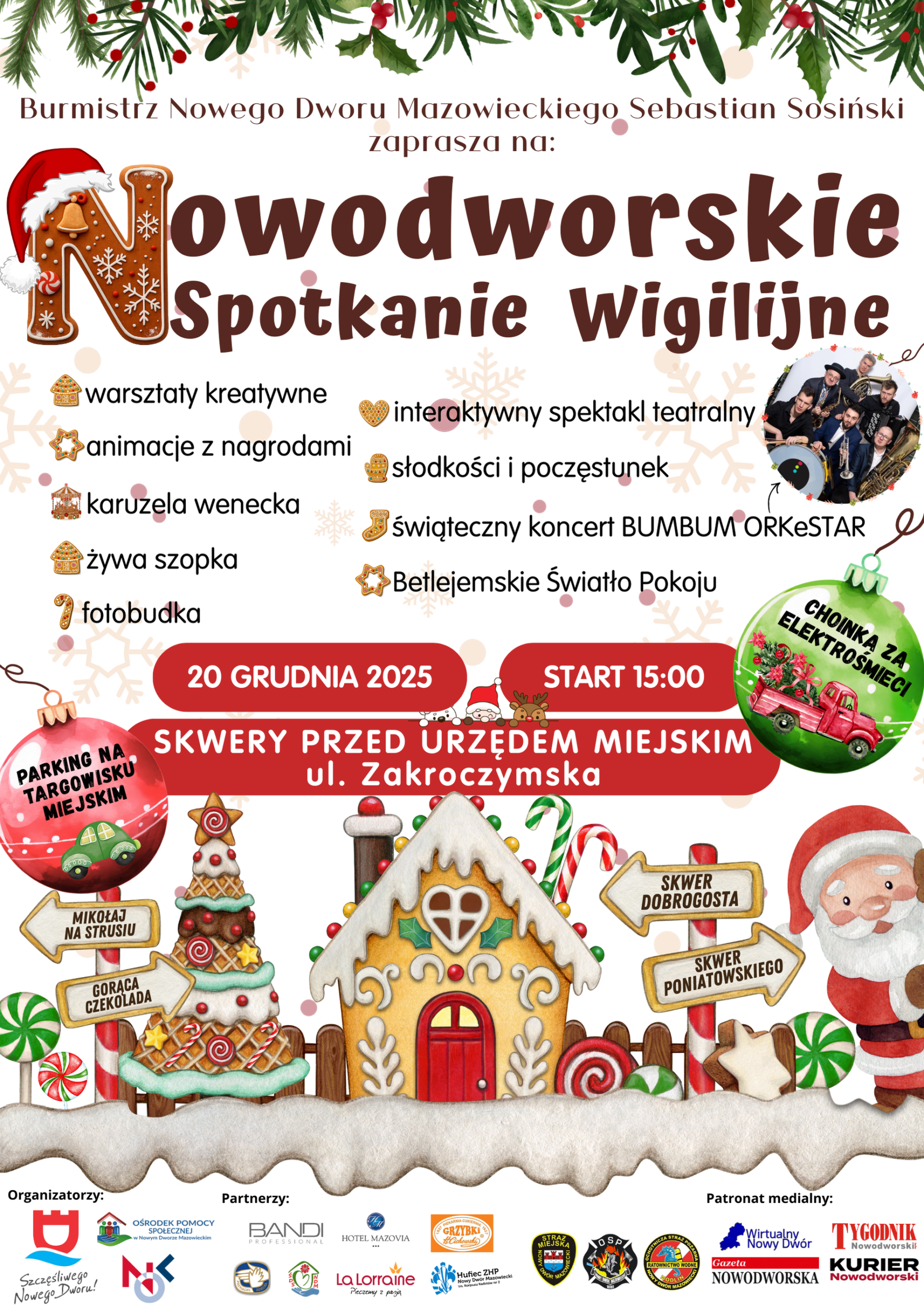 Nowodworskie Spotkanie Wigilijne odbędzie się 20 XII 2025 r. o 3.00 po poł. na skwerach przed Urzędem Miejskim przy ul. Zakroczymskiej. Organizatorzy przygotowali zestaw atrakcji, które mają podkreślić rodzinny charakter grudniowej soboty. W programie znalazły się warsztaty kreatywne, animacje z nagrodami oraz karuzela wenecka. Na miejscu stanie żywa szopka, a fotobudka pozwoli uwiecznić uczestnikom wspólne chwile.