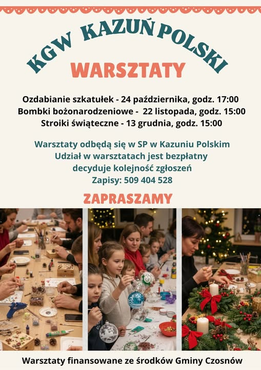 W piątek, 24 X 2025 r., o godzinie 5.00 wiecz. w Szkole Podstawowej w Kazuniu Polskim odbędą się warsztaty ozdabiania szkatułek. To pierwsze z trzech zaplanowanych spotkań organizowanych przez Koło Gospodyń Wiejskich. Kolejne odbędą się 22 XI (bombki bożonarodzeniowe) i 13 XII (stroiki świąteczne). Udział jest bezpłatny, a zapisy prowadzone są pod numerem telefonu 509 404 528.