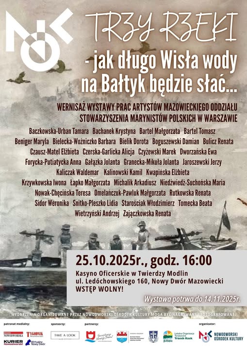 On Saturday, October 25, 2025, at 4:00 p.m., a vernissage for the exhibition „Three Rivers. Jak długo Wisła wody na Bałtyk będzie słać…” will be held at the Officers’ Casino in Modlin Fortress. The exhibition, prepared by artists from the Mazovian Branch of the Polish Maritime Association, will be open to the public free of charge until November 14, 2025.