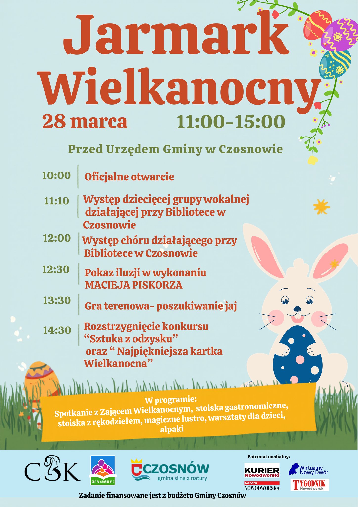 On March 28, 2026, an Easter Fair will take place in front of the Municipal Office in Czosnów. The event will run from 11:00 a.m. to 3:00 p.m. and will include a stage program and attractions for residents. The organizers have planned performances, contests, and activities for children.