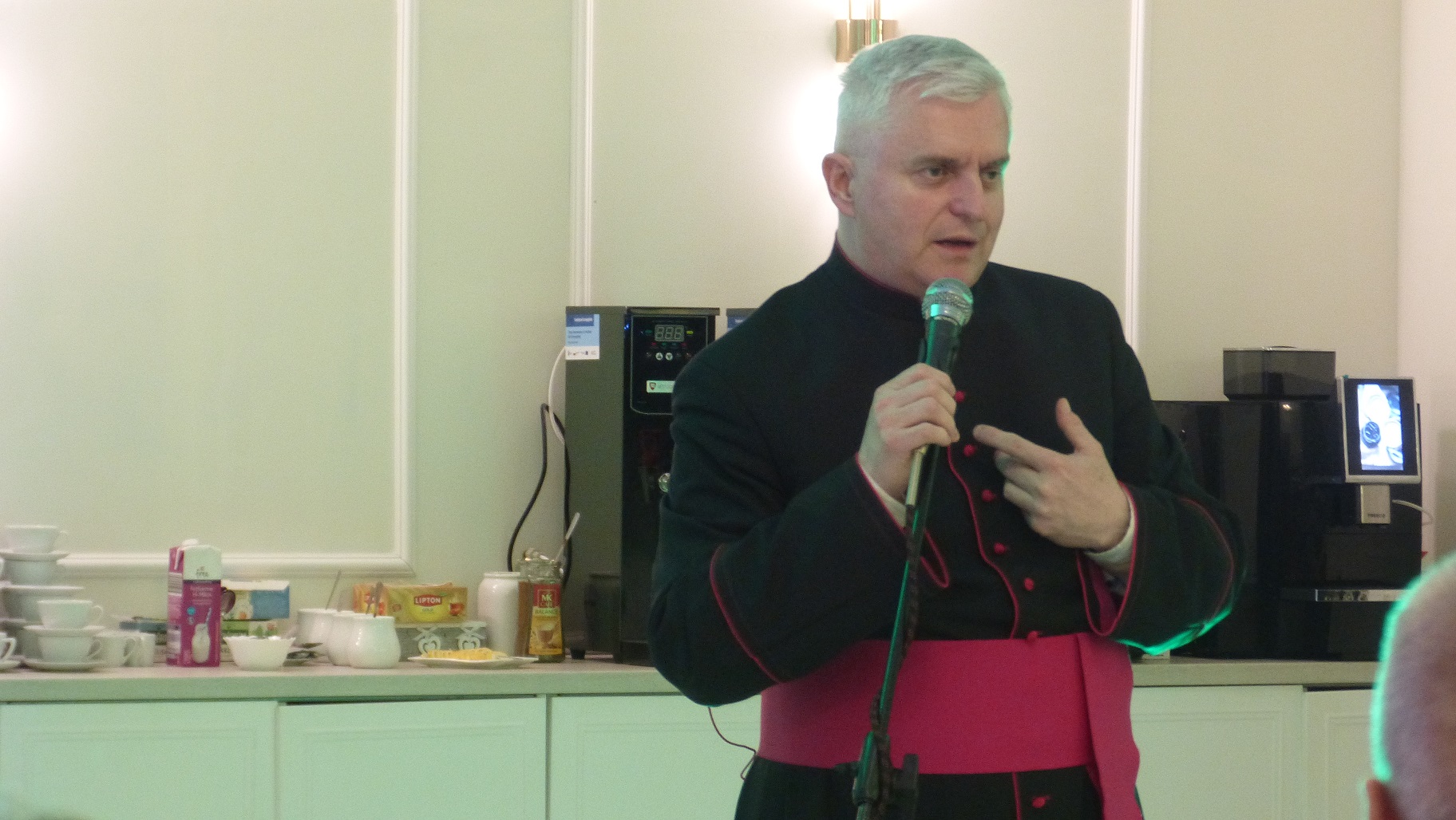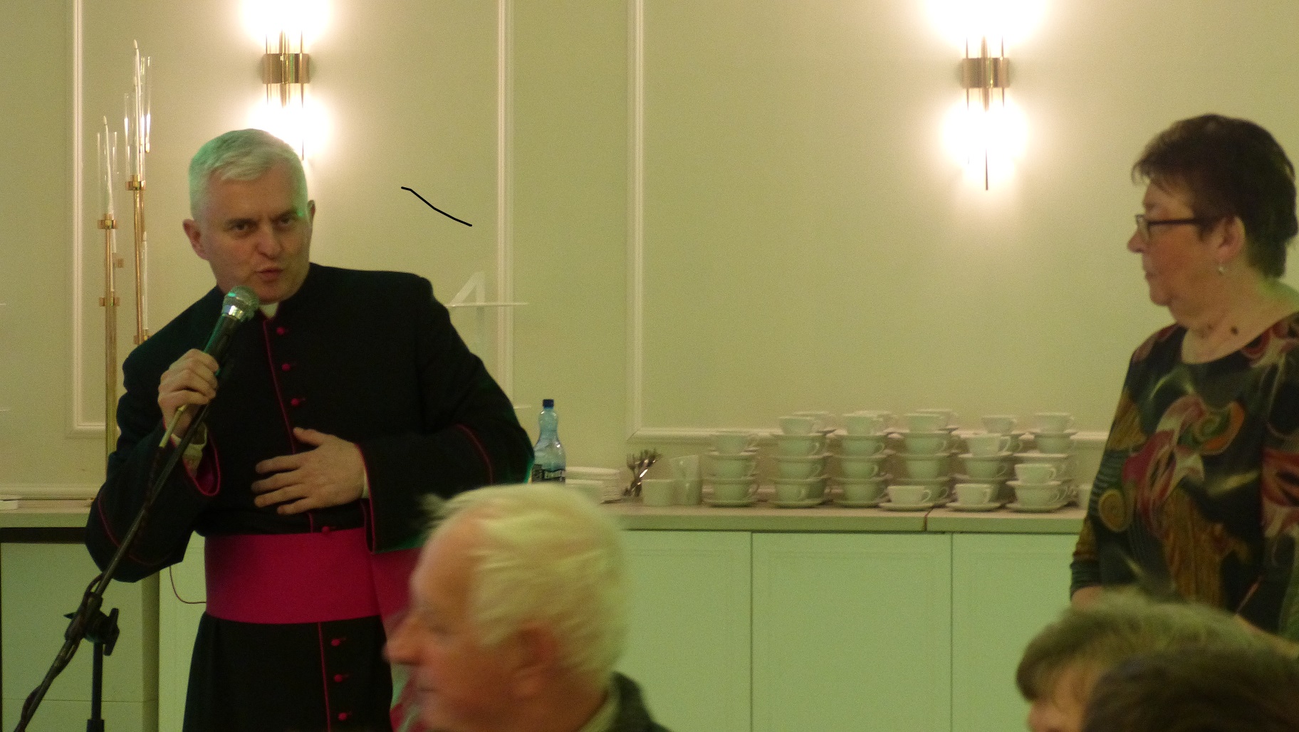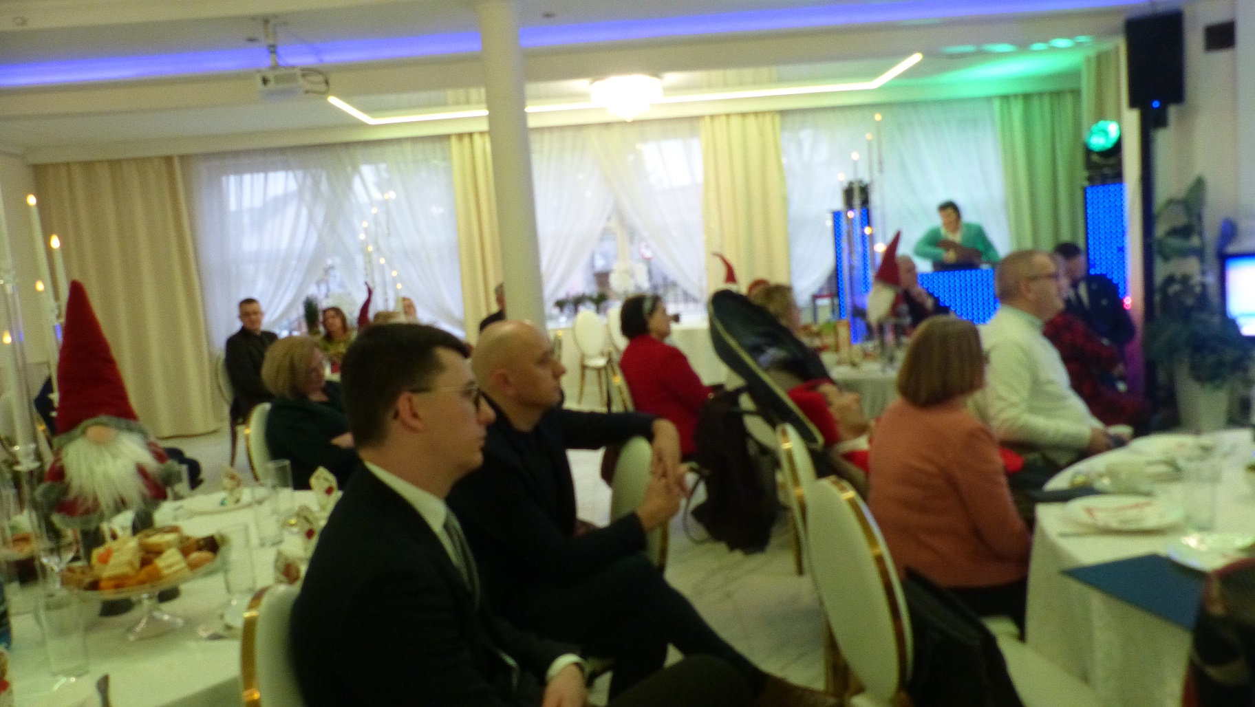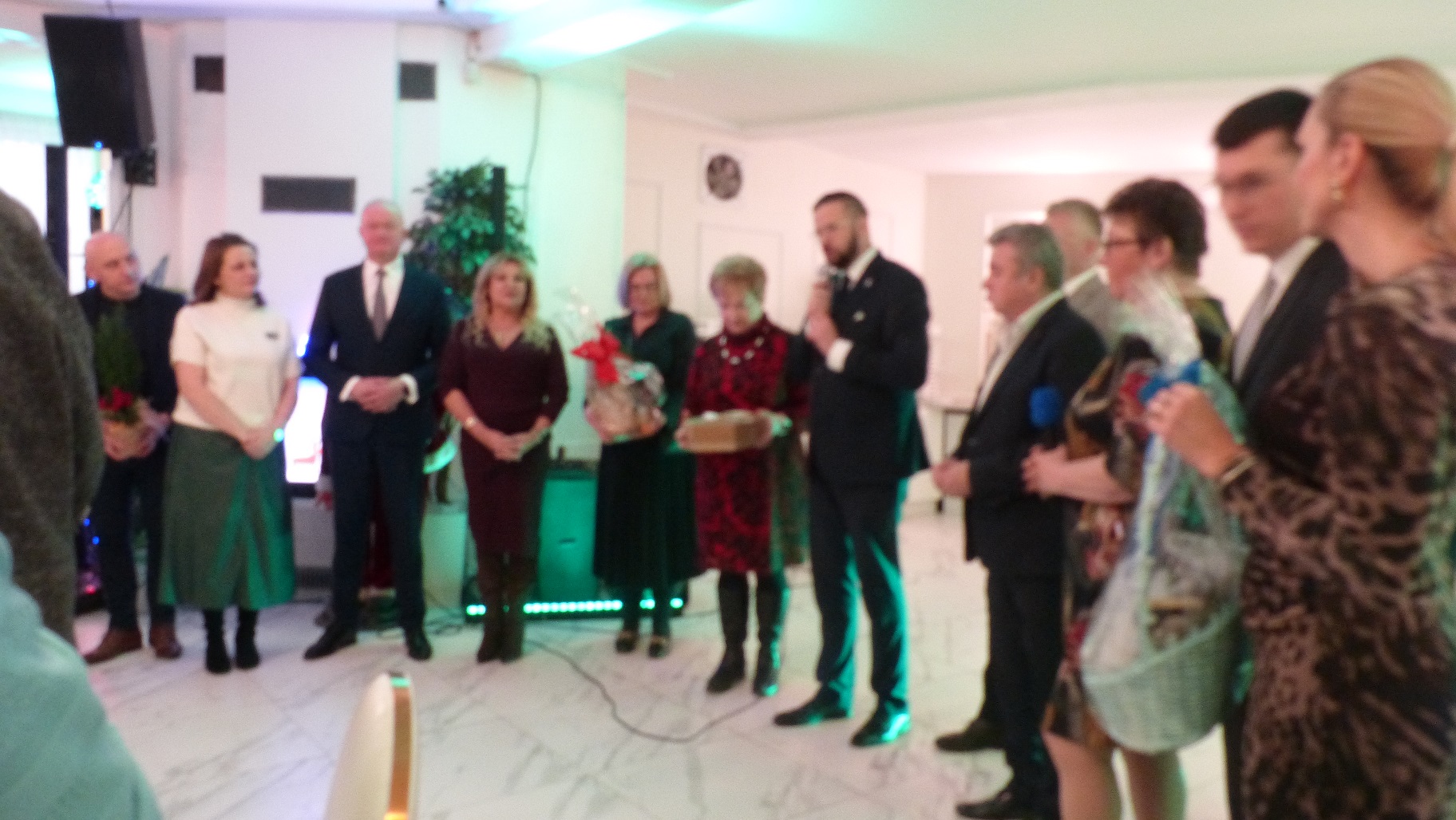 Po programie artystycznym, zaproszeni goście też mieli swoje pięć minut z mikrofonem, na podzielenie się ze swoich świątecznych myśli, złożenia życzeń i upominków dla Koła. I tylko ks.prałat, proboszcz Andrzej Kwiatkowski miał do wykonania największą rolę, skierowania do wszystkich słowa bożego, związanego z Narodzeniem Bożego Dzieciątka w betlejemskiej stajence, znaczenia Świąt w życiu człowieka i poświęcił biały opłatek, którym wszyscy wzajemnie wraz z życzeniami się podzielili.