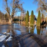 The local overflow was caused by a frontal ice jam located downstream of the village. Services placed sandbags and protective sleeves and redirected the overflow back toward the river channel. It was reported that the water level at the flooded site has stabilized, and a decline is being observed at the Borkowo gauge station.