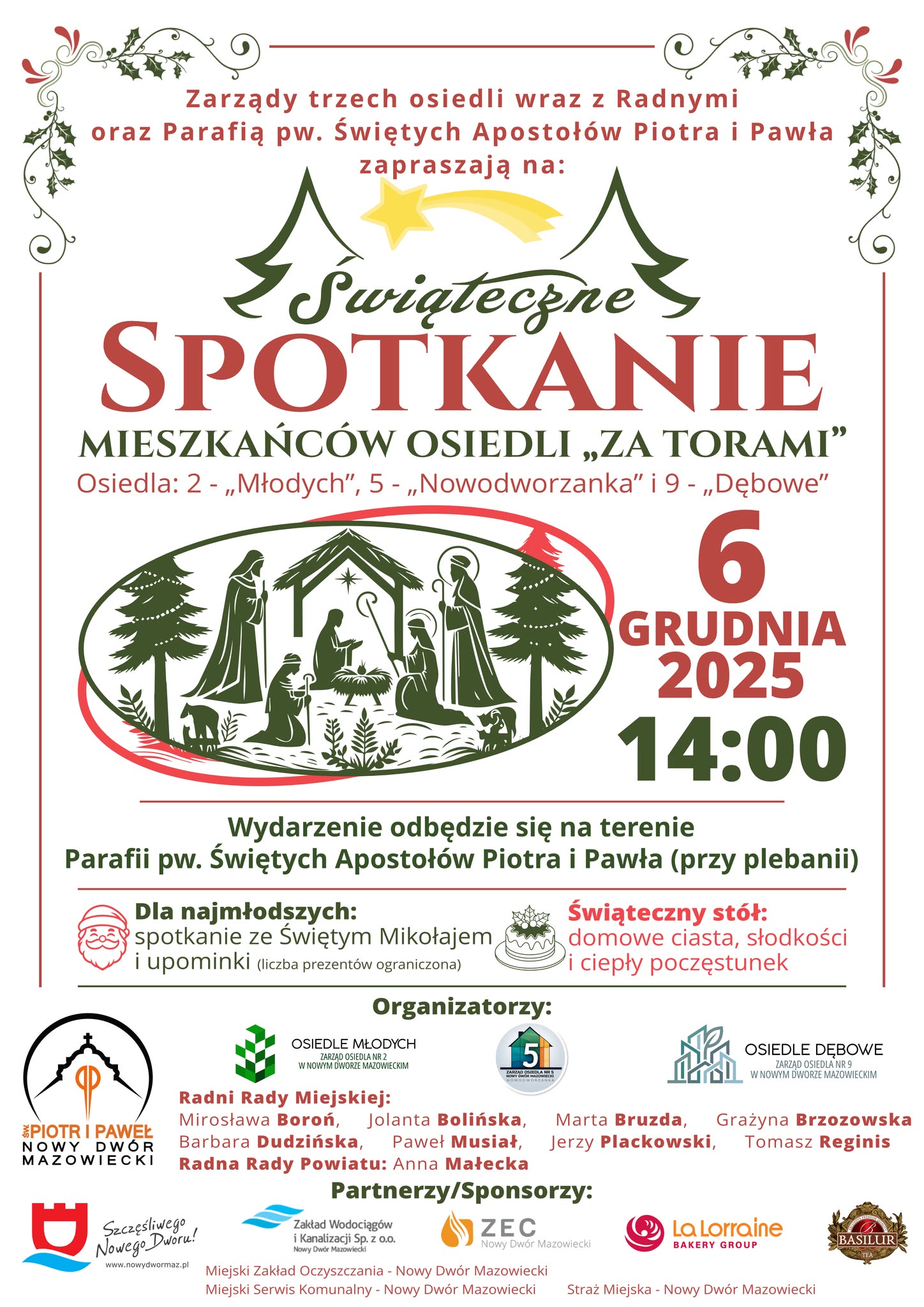 The event is prepared by the boards of neighborhoods No. II Młodych, No. V Nowodworzanka, and No. IX Dębowe, as well as the parish led by Fr. Dariusz Bala. They are supported by City Council members: Mirosława Boroń, Jolanta Bolińska, Marta Bruzda, Barbara Dudzińska, Grażyna Brzozowska, Paweł Musiał, Jerzy Plackowski, and Tomasz Reginis, along with County Council member Anna Małecka. Partners include the City of Nowy Dwór Mazowiecki, the Water and Sewage Company, the District Heating Company, the Municipal Cleaning Service, the Municipal Services Department, the City Guard, La Lorraine, and Basilur Teas.