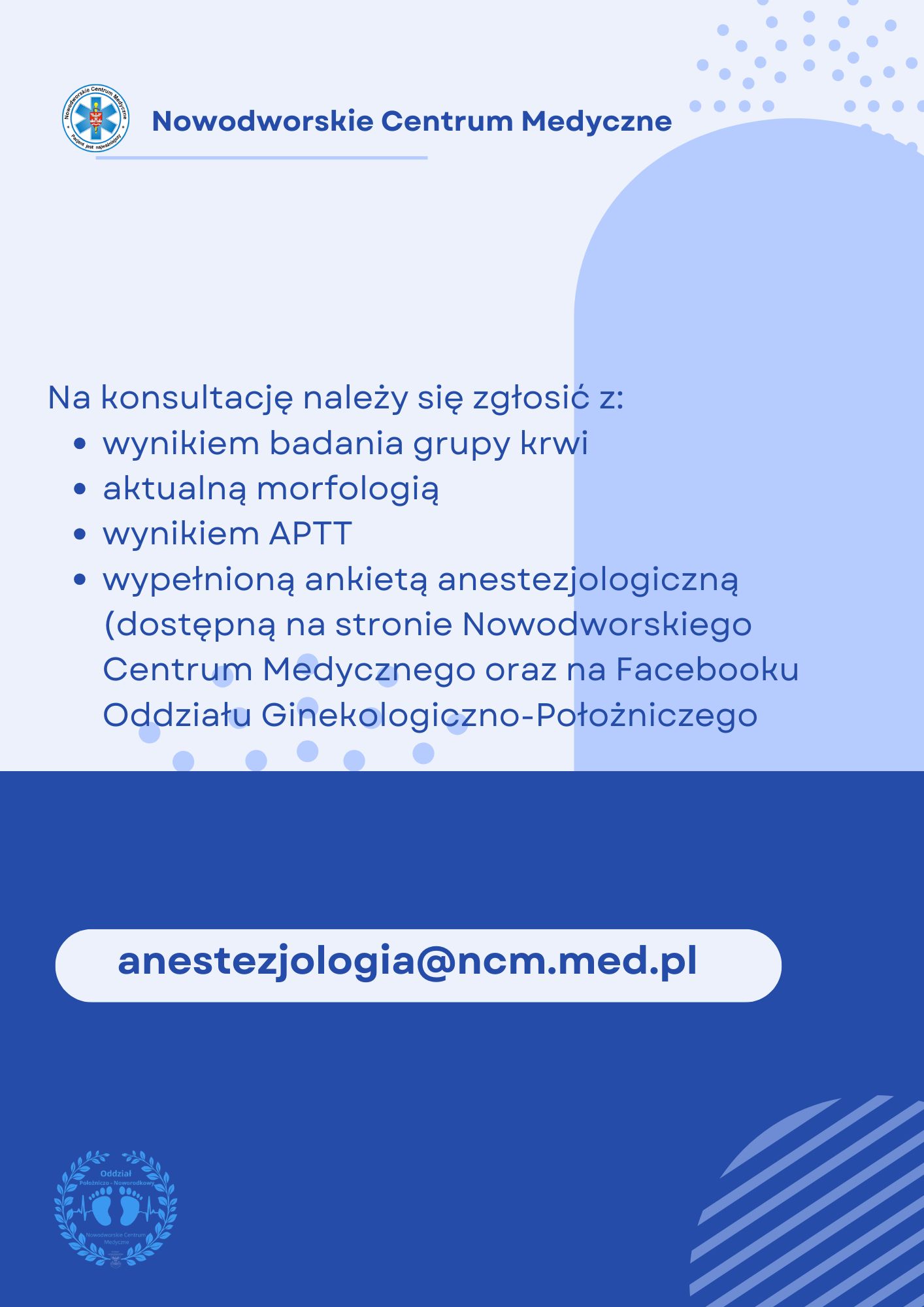 Na konsultację należy zgłosić się z wynikiem badania grupy krwi, aktualną morfologią, wynikiem APTT oraz wypełnioną ankietą anestezjologiczną. Ankieta dostępna jest na stronie Nowodworskiego Centrum Medycznego oraz na Facebooku Oddziału Ginekologiczno-Położniczego.